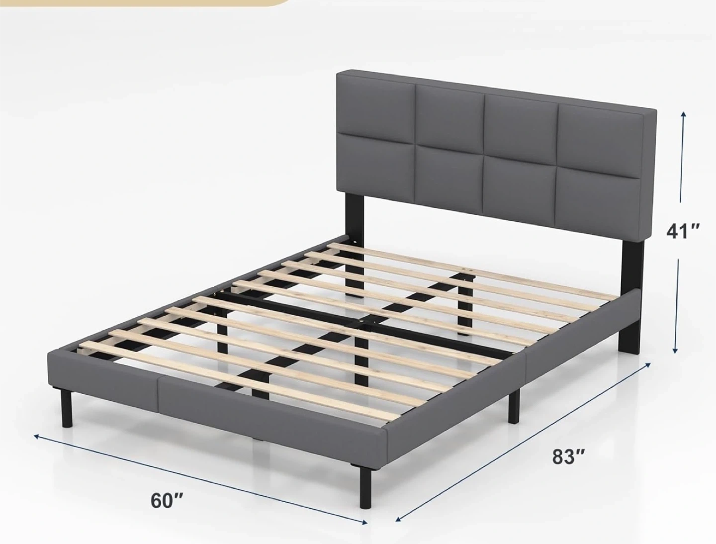 Grey upholstered bed frame with a modern square tufted headboard. Includes wooden slats for mattress support. Overall dimensions: 83" L x 60" W x 41" H.