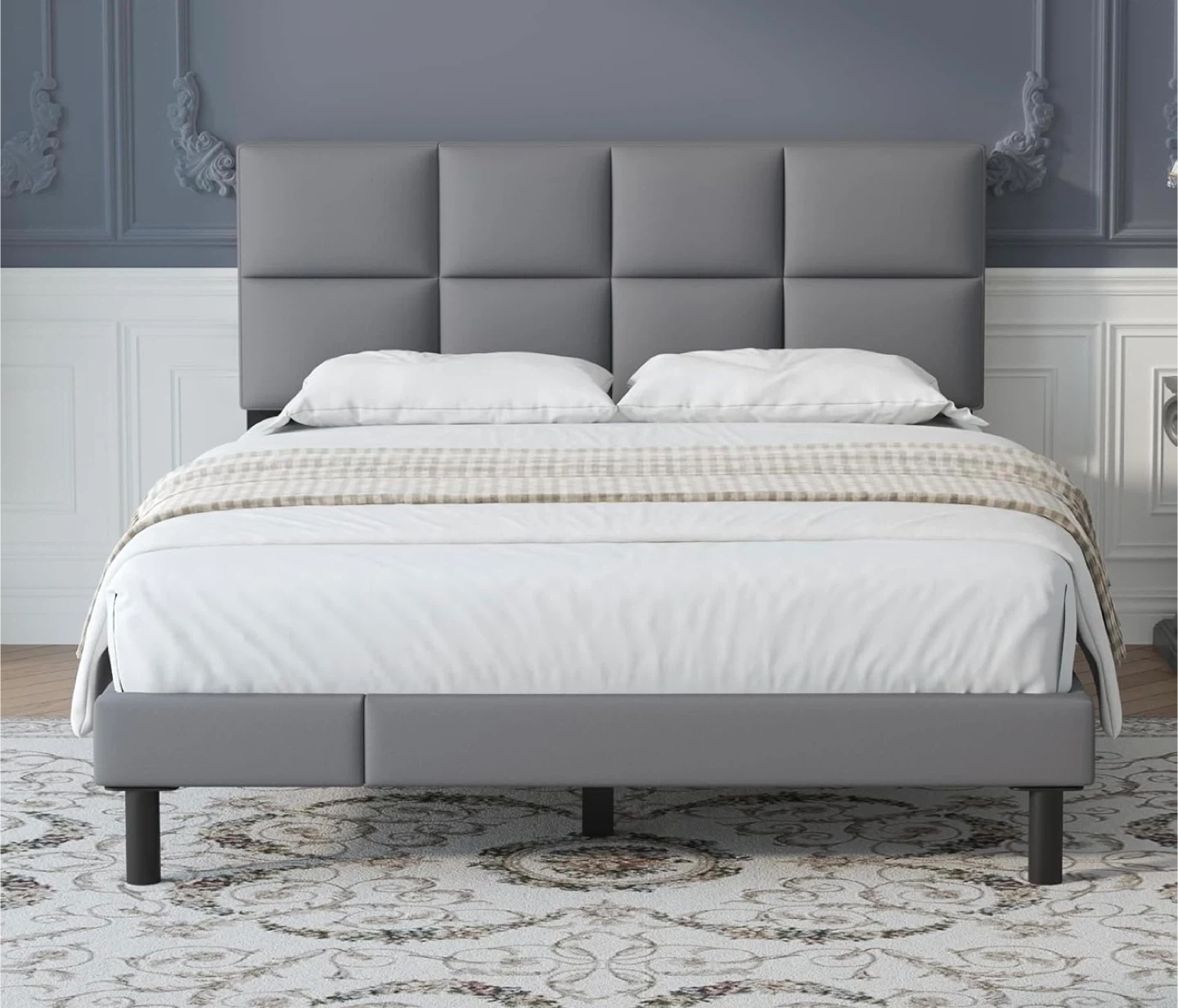 Grey Upholstered Queen Bed Frame with Headboard