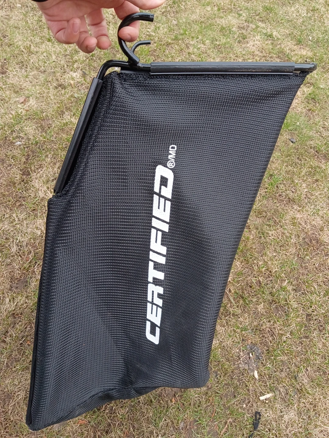 This is a replacement grass catcher bag for lawn mowers. It's made of durable black fabric with a reinforced top. The bag features the "CERTIFIED" logo.