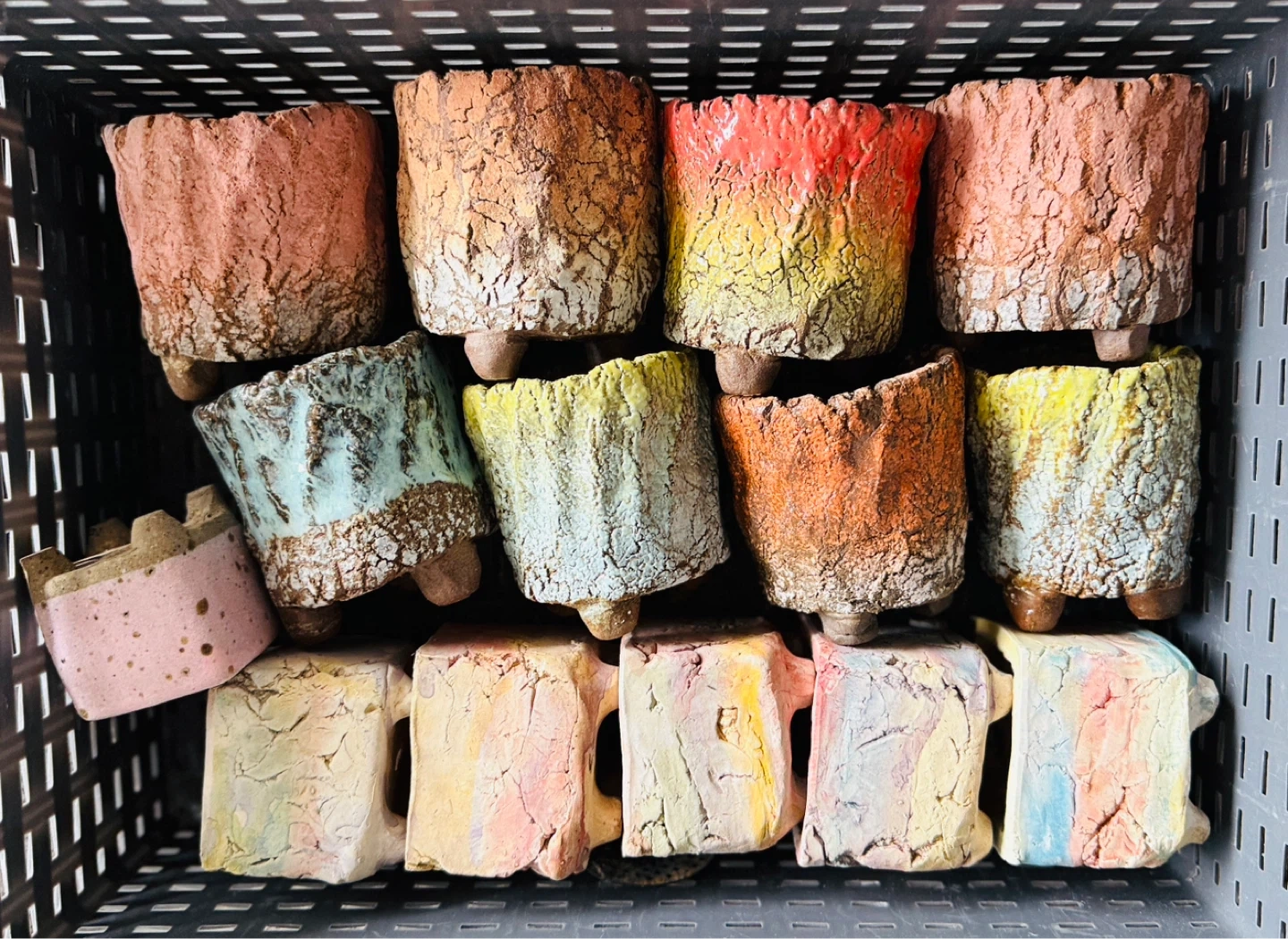 A collection of assorted ceramic plant pots in various colours and crackled finishes. These pots are perfect for small plants and succulents. They're made from durable ceramic material.