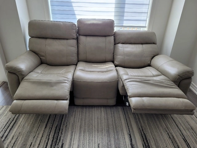 Beautiful set and LIKE NEW!!! The Stallion sofa features a sleek silhouette upholstered in top-grain leather on the seating area and matching PVC on the sides and back. Accent stitching adds style and the dual reclining mechanism allows you to adjust the headrest and footrest to your ideal angle. Stay connected to friends and family with the built-in USB ports. Sofa Dimensions: Width 82" Height 40" Depth 40". Recliner Dimensions: Width 38" Height 40" Depth 40". Original price was $4,700. Selling now for $1500. Cash accepted.