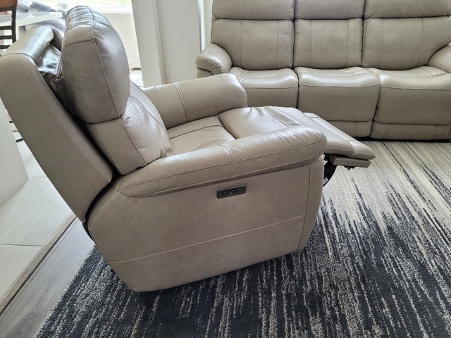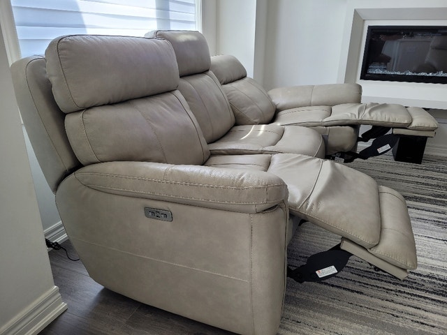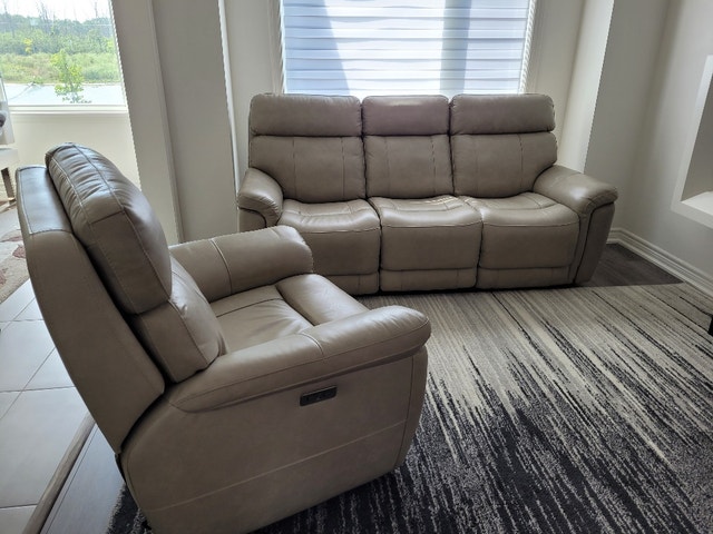 Beautiful set and LIKE NEW!!! The Stallion sofa features a sleek silhouette upholstered in top-grain leather on the seating area and matching PVC on the sides and back. Accent stitching adds style and the dual reclining mechanism allows you to adjust the headrest and footrest to your ideal angle. Stay connected to friends and family with the built-in USB ports. Sofa Dimensions: Width 82" Height 40" Depth 40". Recliner Dimensions: Width 38" Height 40" Depth 40". Original price was $4,700. Selling now for $1500. Cash accepted.