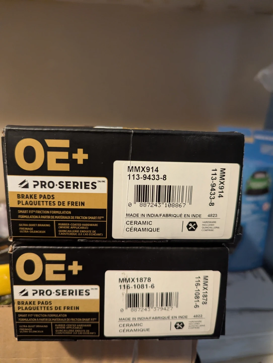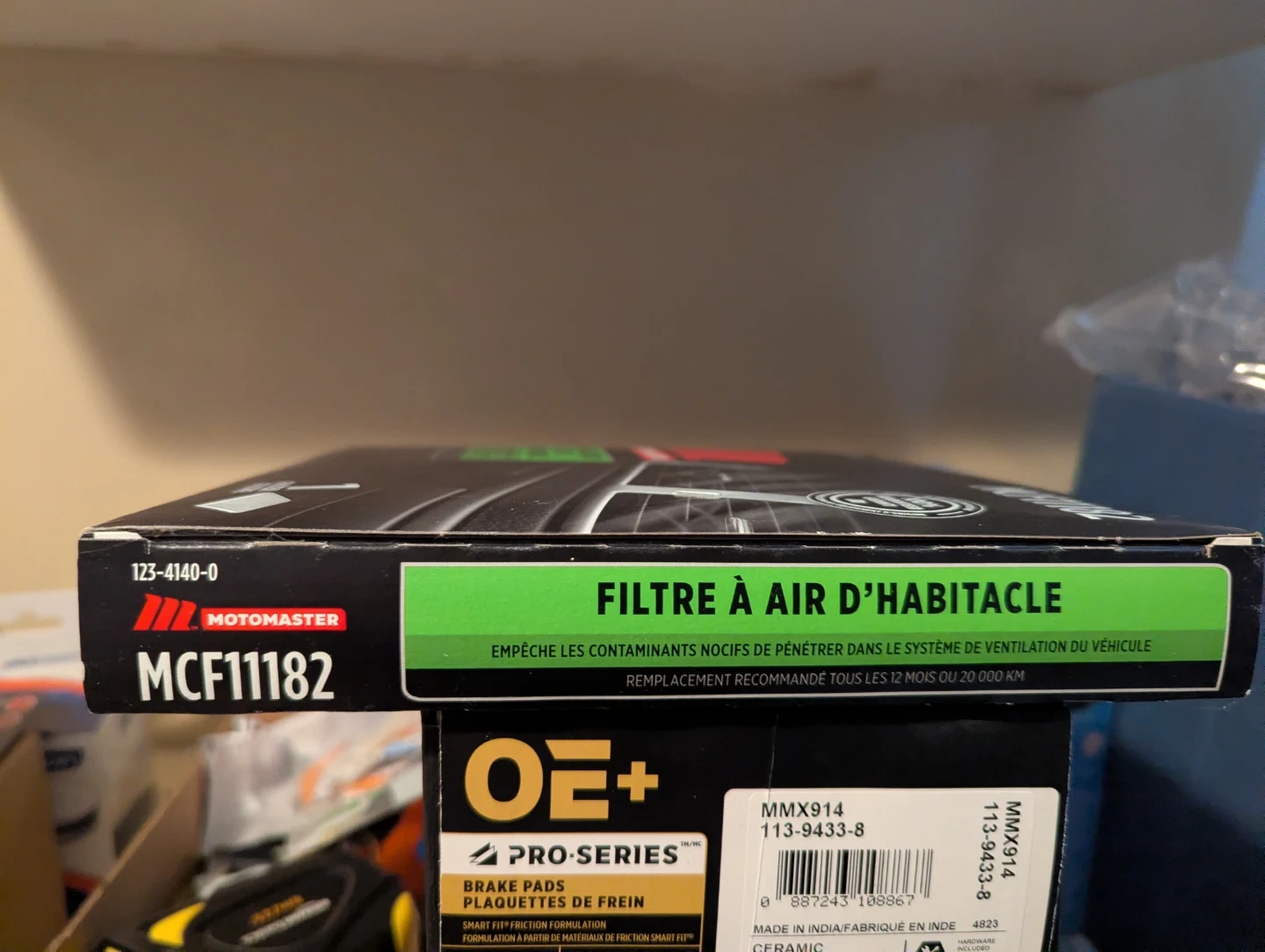 Selling OE+ Pro-Series brake pads and a Motomaster cabin air filter.
