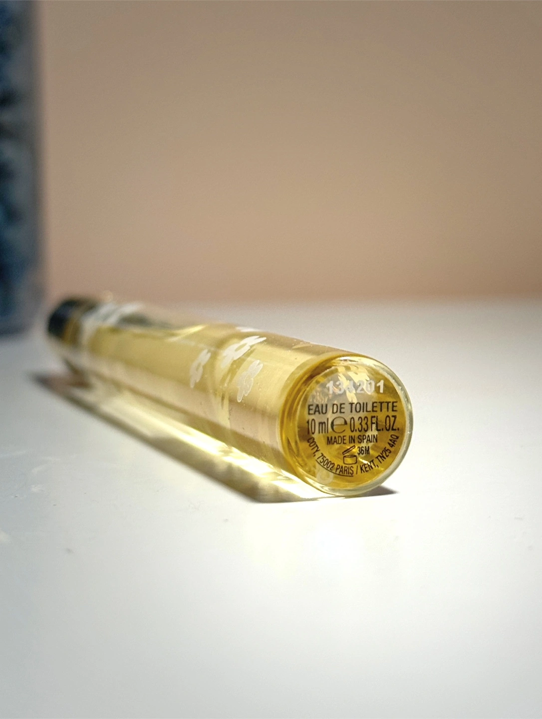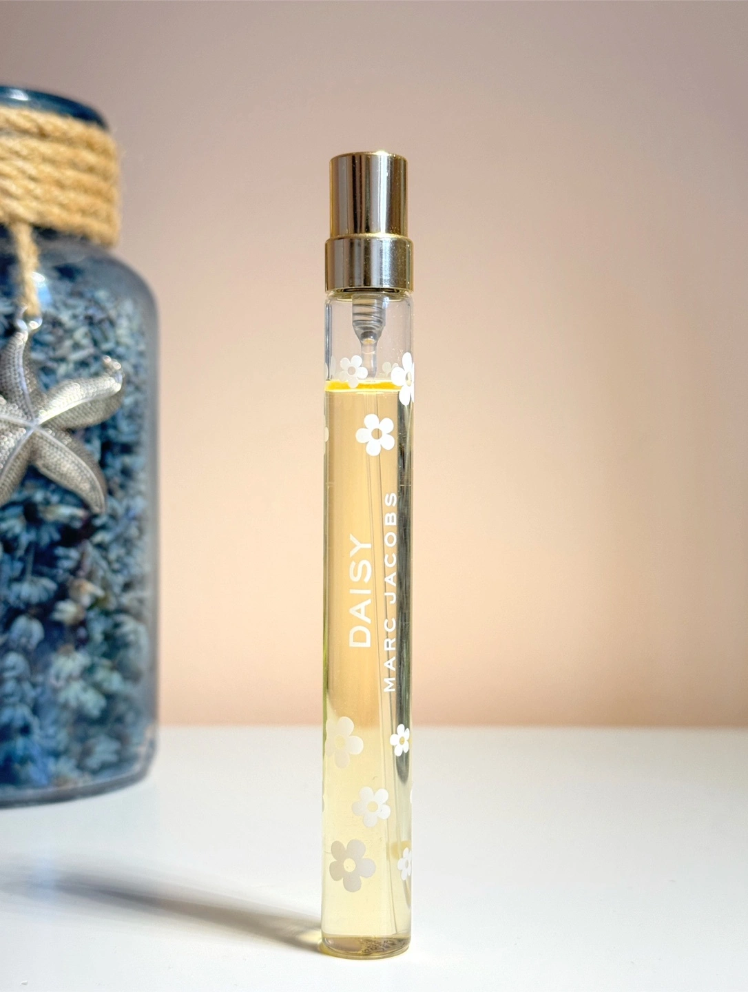 Marc Jacob Daisy mini size perfume, with a gold-colored cap. The perfume is in a clear container, decorated with white flowers. A perfect item to keep on your desk for a quick refresh when you need it. Perfect for travel. 10ML