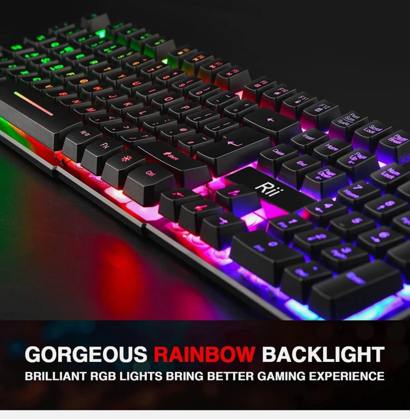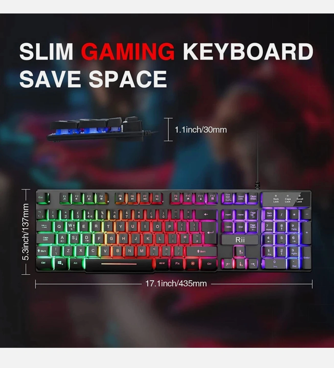 This is a Rii slim gaming keyboard with a gorgeous rainbow backlight. It offers 19 anti-gosting keys for non-conflict input. The keyboard measures 17.1 inches by 5.3 inches by 1.1 inches.
