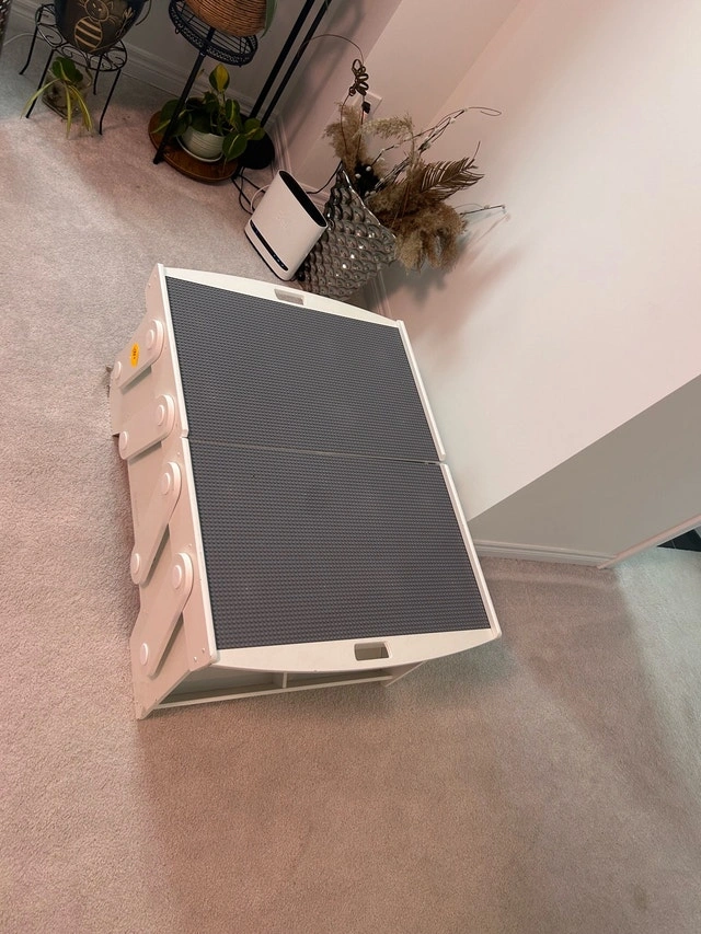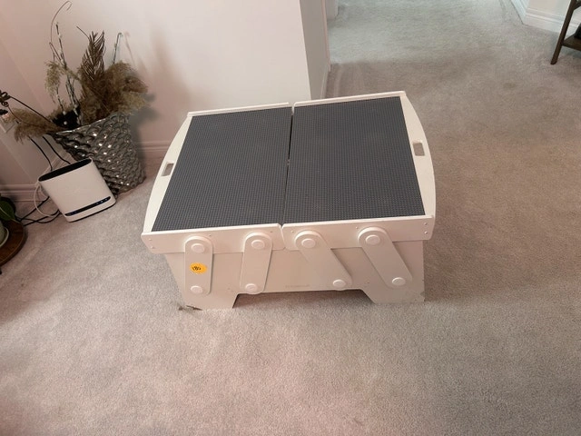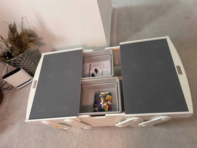 This Lego table is perfect for any young builder, featuring a grey building surface and convenient built-in storage. Small transportation chip at left leg. Grey Building Surface Built-in Storage. If this ad is still up, the table is still available.