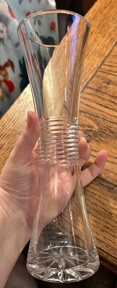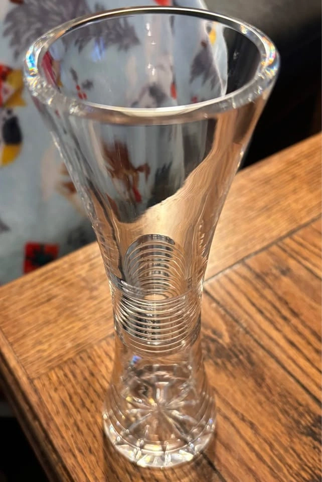 Perfect condition, like new. Heavy sleek bohemian cut crystal corset vase. Has a twisted corkscrew spiral cut into the middle, and a starburst on the bottom. Very nice modern look. Heavy thick base, overall a thick walled vase. No chips or cracks. Just under 10” tall, 3.25” across the top. Crystal is 1/4 of an inch thick. All items are sold using a pickup tote for contactless pickups. Cash or e-transfer accepted.