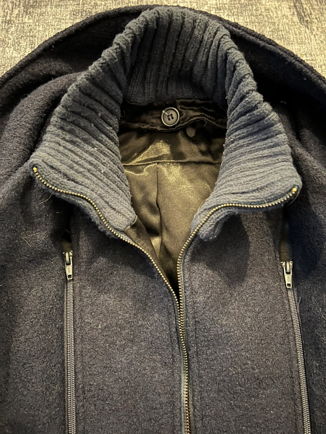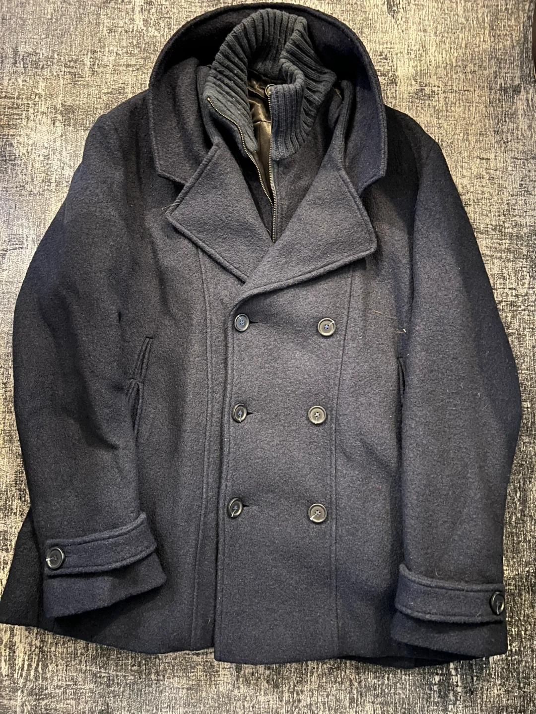 Gorgeous, dignified men’s peacoat from Le Château. Cozy 50% wool. Made in Canada. Removable coat-length collar makes it versatile for spring and fall.