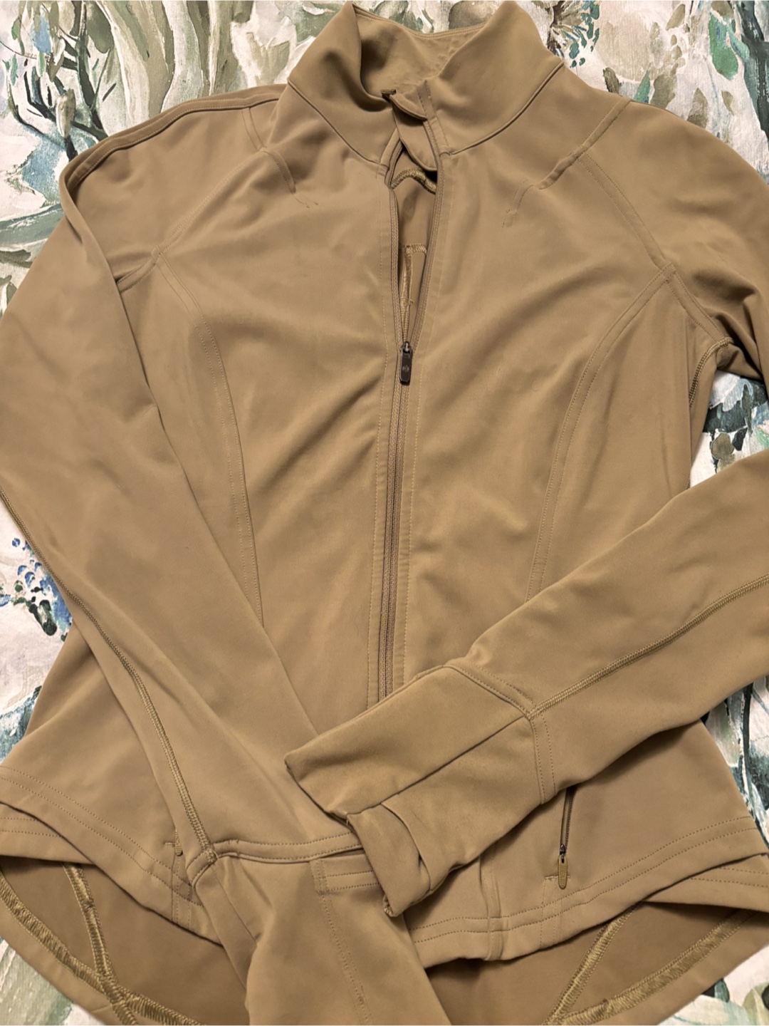 An Bronze Green active jacket. Features a full zipper and pockets. Perfect to wear while you enjoy a peaceful walk outside.