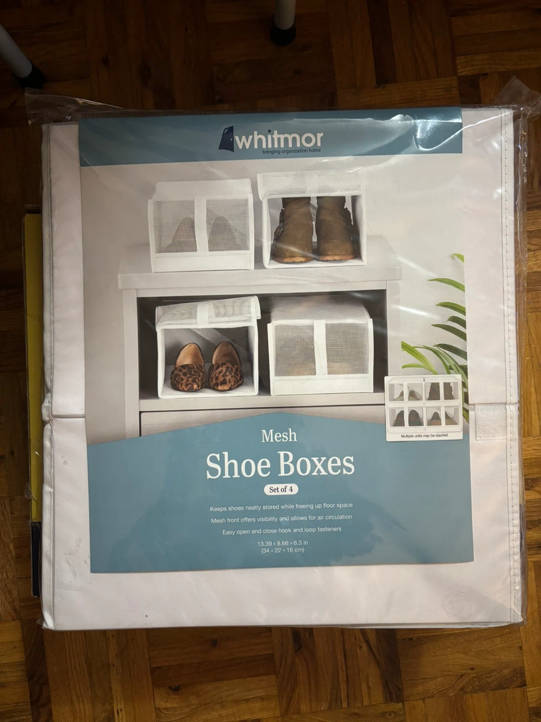 Keep your shoes neatly stored while freeing up floor space with this set of 4 Whitmor mesh shoe boxes! The mesh front offers visibility and allows for air circulation. They feature easy open and close hook and loop fasteners. Dimensions are 13.39 x 8.66 x 6.3 inches (34 x 22 x 16 cm)