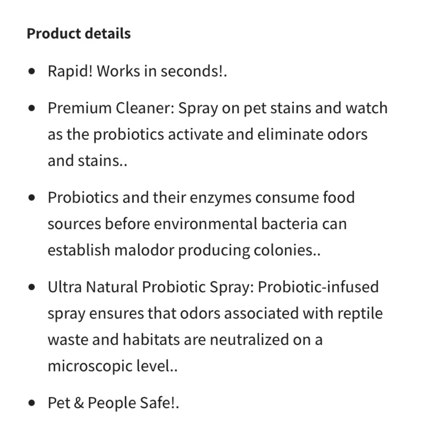 Ultra Natural Probiotic Odor Eliminator & Cleaner for reptiles. This spray is all-natural and eco-friendly. It's formulated to neutralize odors at a microscopic level. Great for maintaining a clean reptile habitat!