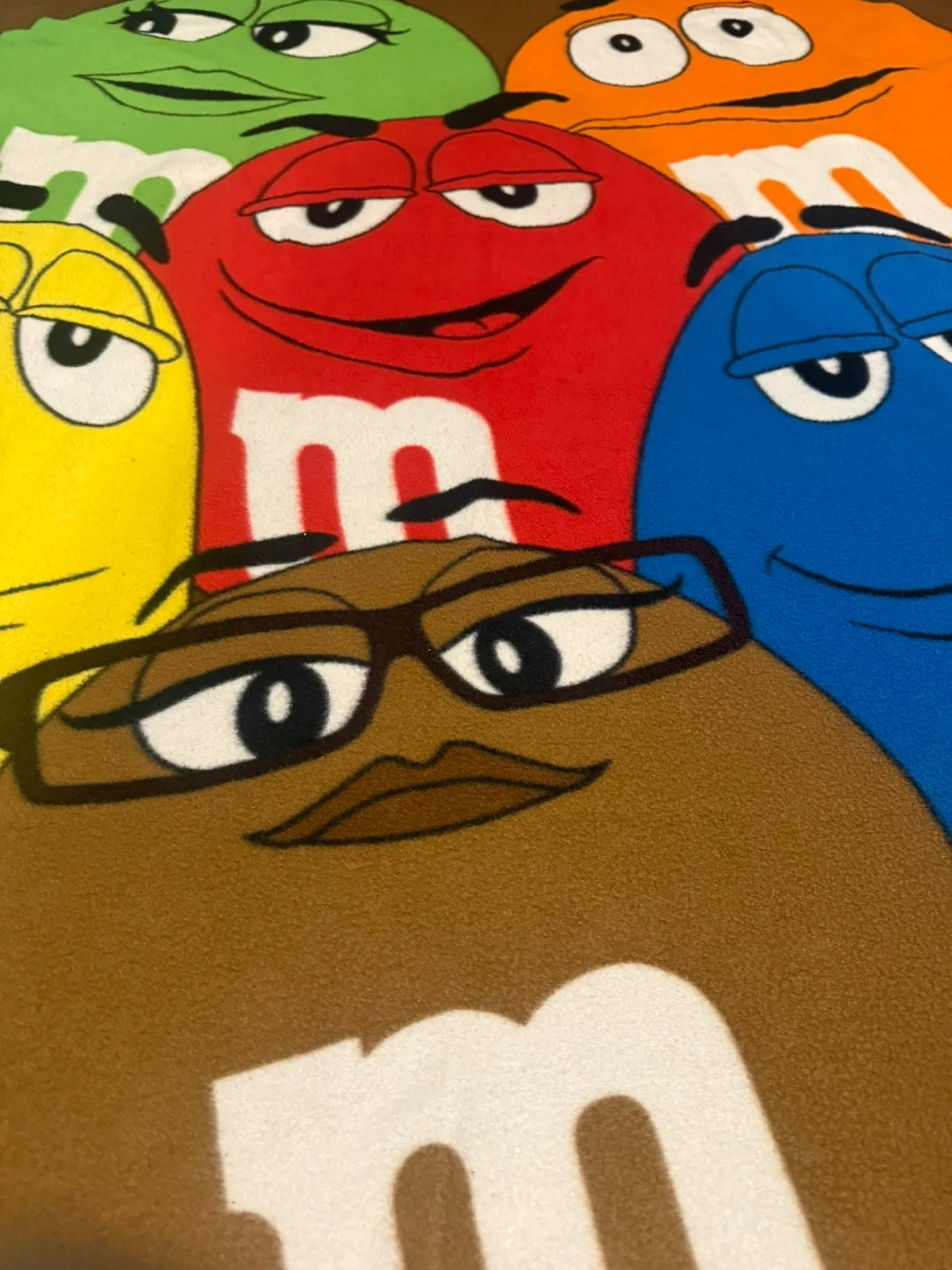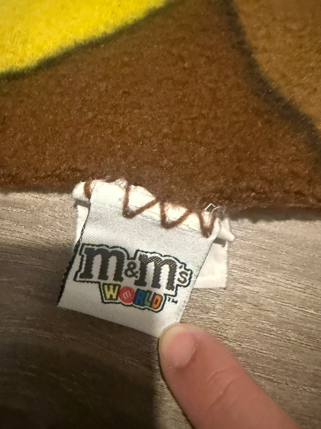 Soft fleece throw blanket featuring the classic M&M characters. Made in China for Mars and its affiliates, dated 2013. Great for fans of M&M's!