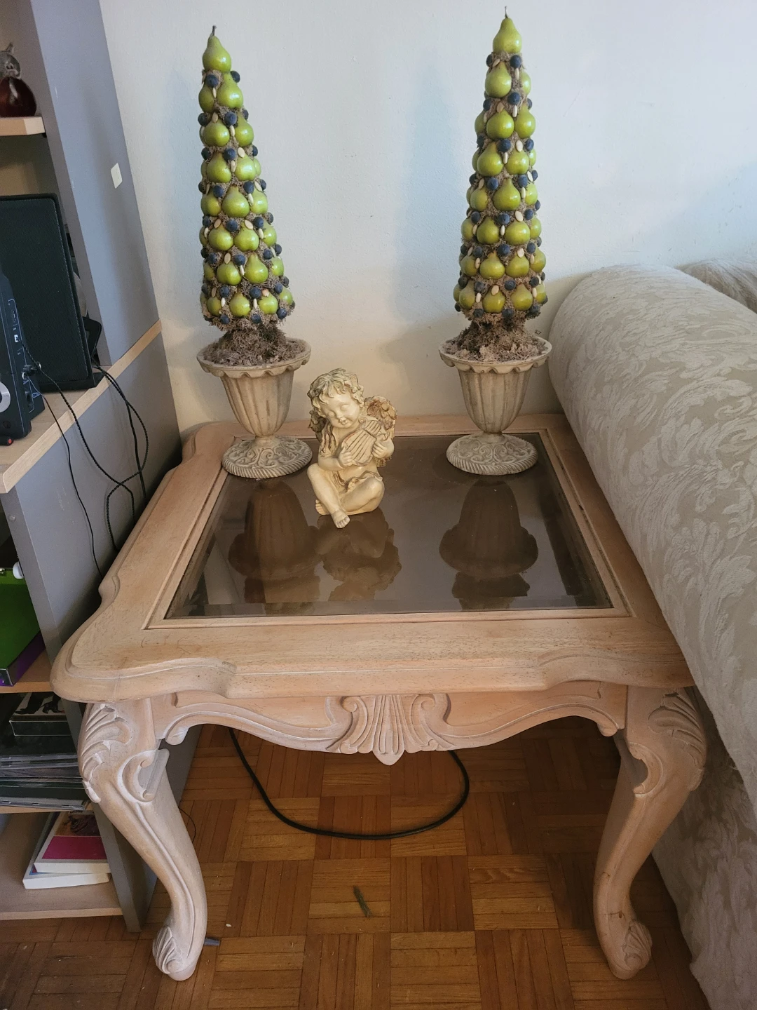 Selling a glass top side table. It has a light wood frame with decorative carvings on the legs. Also included are two decorative pear topiary trees and a small angel statue. Perfect for adding a touch of elegance to your living room!