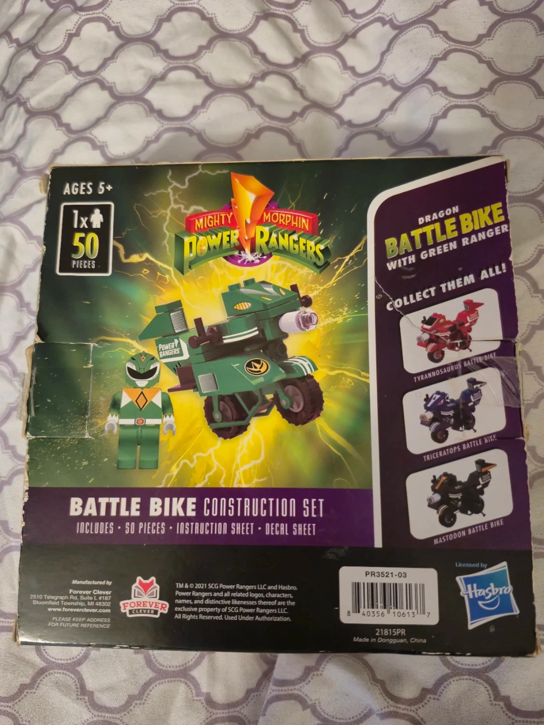 This is the Mighty Morphin Power Rangers Dragon Battle Bike Construction Set with Green Ranger. It includes 50 pieces and a decal sheet. The set is compatible with other brands. Ages 5+.