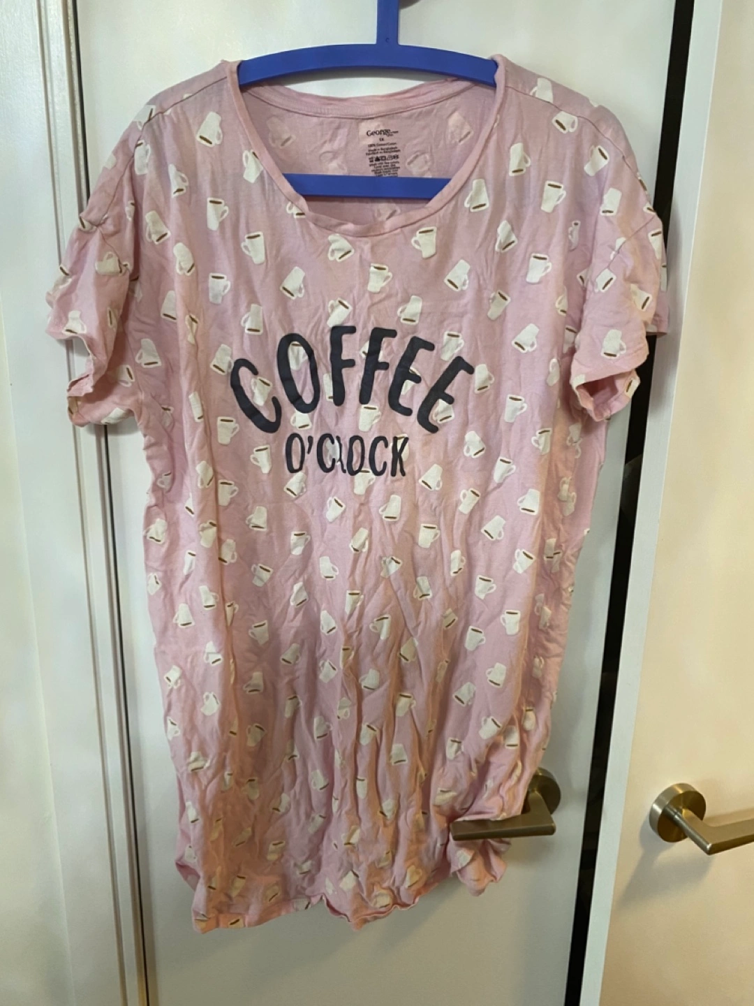 Selling a cute George t-shirt with a fun coffee theme! It's pink with a pattern of coffee cups and the words 'Coffee O'Clock'. Size is 1X.