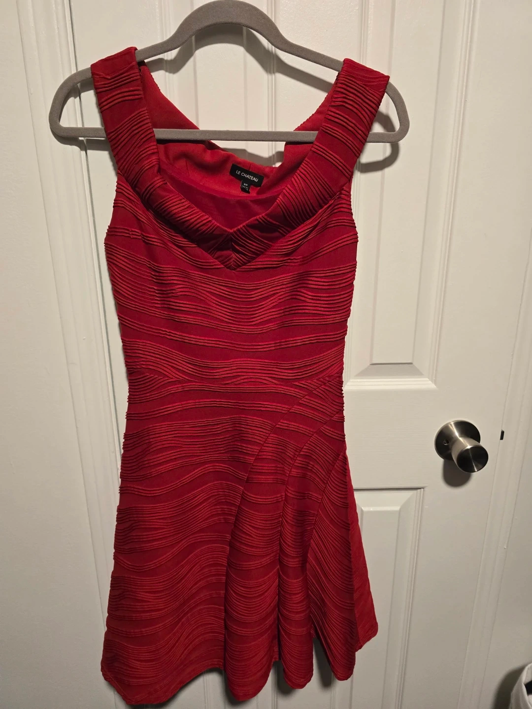 This Le Château dress is a vibrant red with a unique textured design. It features a flattering cowl neckline and a flared skirt. It's suitable for various occasions.