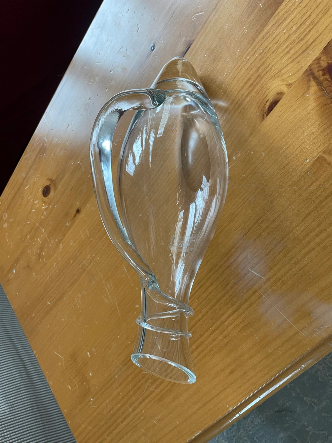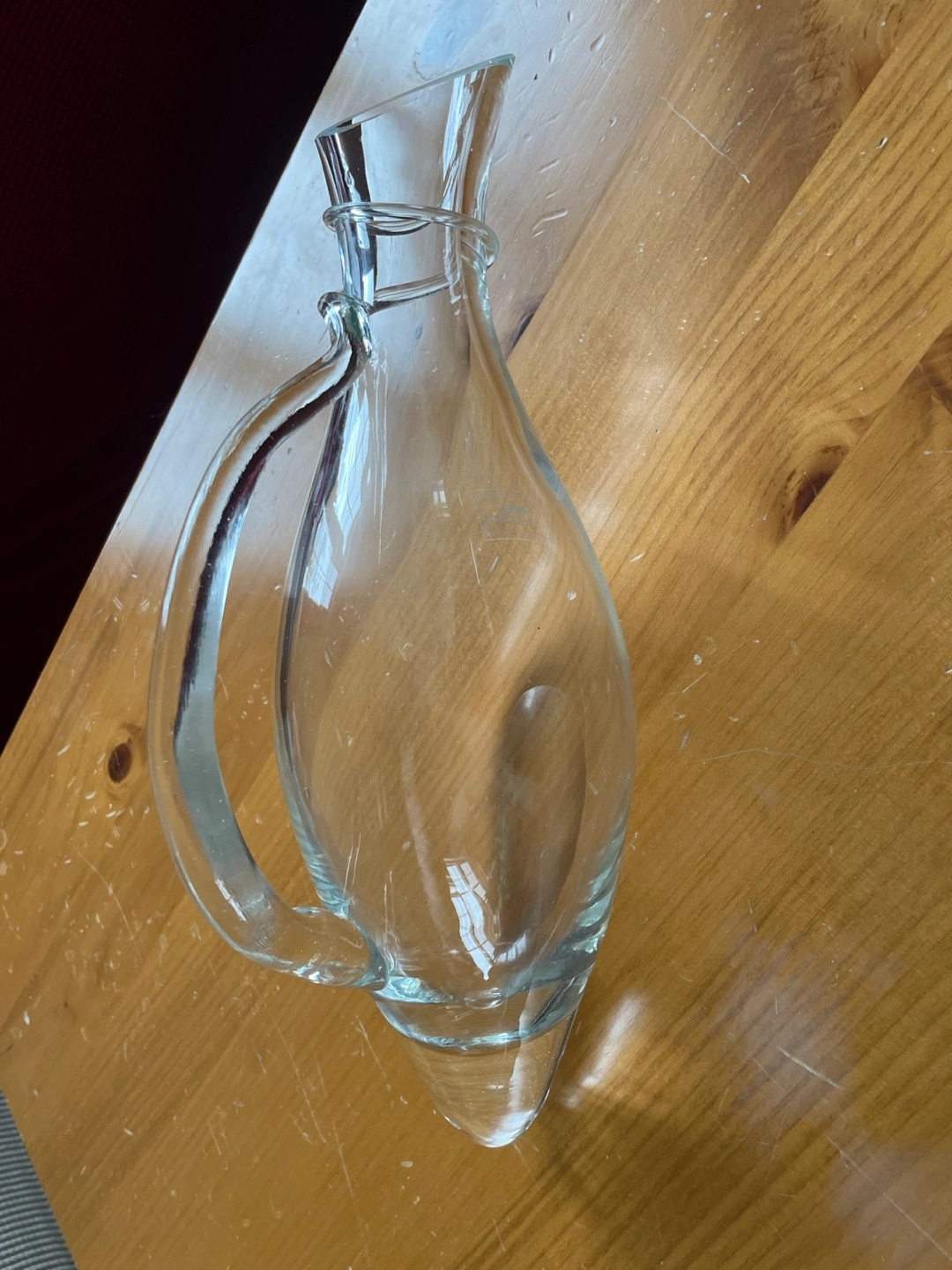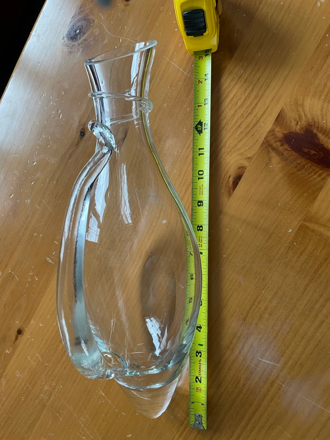 A clear glass pitcher with a unique handle design. It's made of glass and stands about 9 inches tall. This carafe is useful for serving beverages at gatherings. It's great for water, iced tea, or wine!