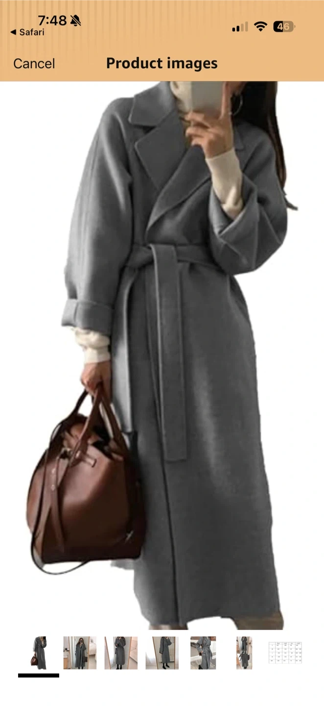 A stylish grey belted coat made from a wool blend. It features a classic lapel design and a tie-waist closure. This coat offers a chic and cozy option for cooler weather.