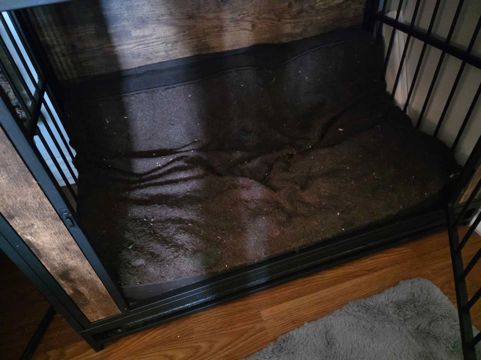 Dimensions are 24 inches wide, 39 inches long, 27 inches tall. Has three entry options, each side and one length way. The other side is the same wooden pattern as the top. There is a bar on the base that is bent, but we always just had this washable memory foam dog bed inside for comfort. Will add this bed for the bar issue. Will also make sure it's washed prior to pickup.