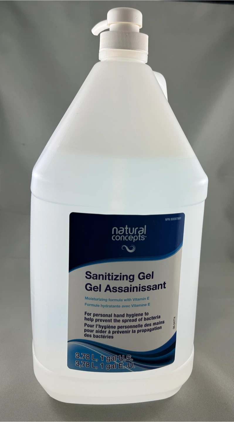 Selling a large container of Natural Concepts Sanitizing Gel. It's a moisturizing formula with Vitamin E for personal hand hygiene to help prevent the spread of bacteria. Contains 3.78 L (1 gal U.S., 1 gal E.U.).