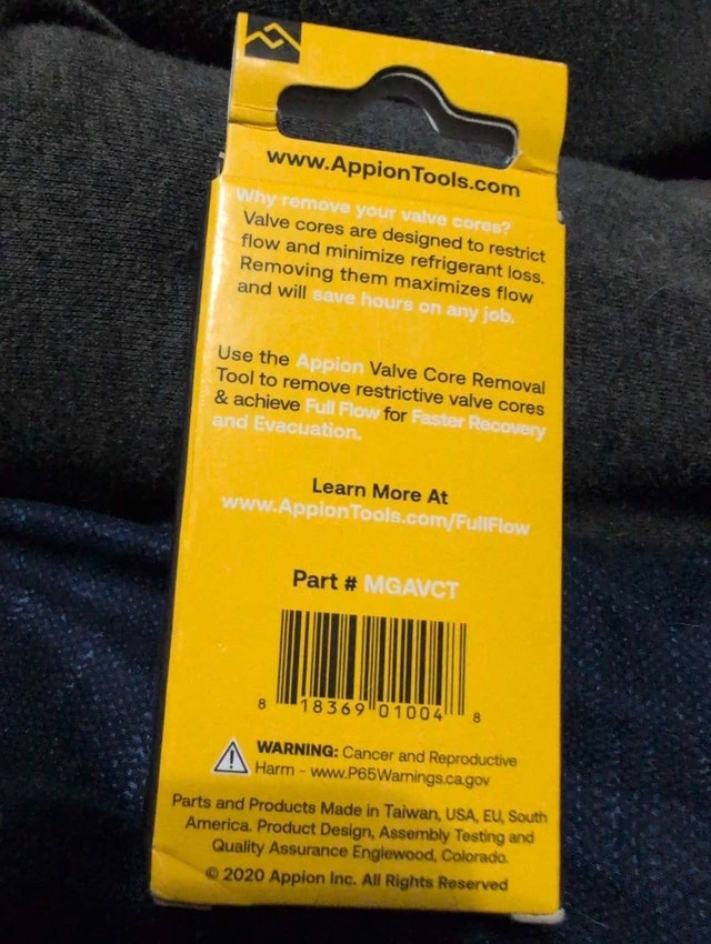 New Appion 1/4in Valve Core Removal Tool. Vacuum-rated to 20 Microns, designed for 1/4in standard system fittings. Features a 1/4in service hose connection and a 1/4in side port for gauges, to help achieve full flow for faster recovery and evacuation. Removing valve cores maximizes flow and can save hours on any job. If the ad's still up, the tool's still available!