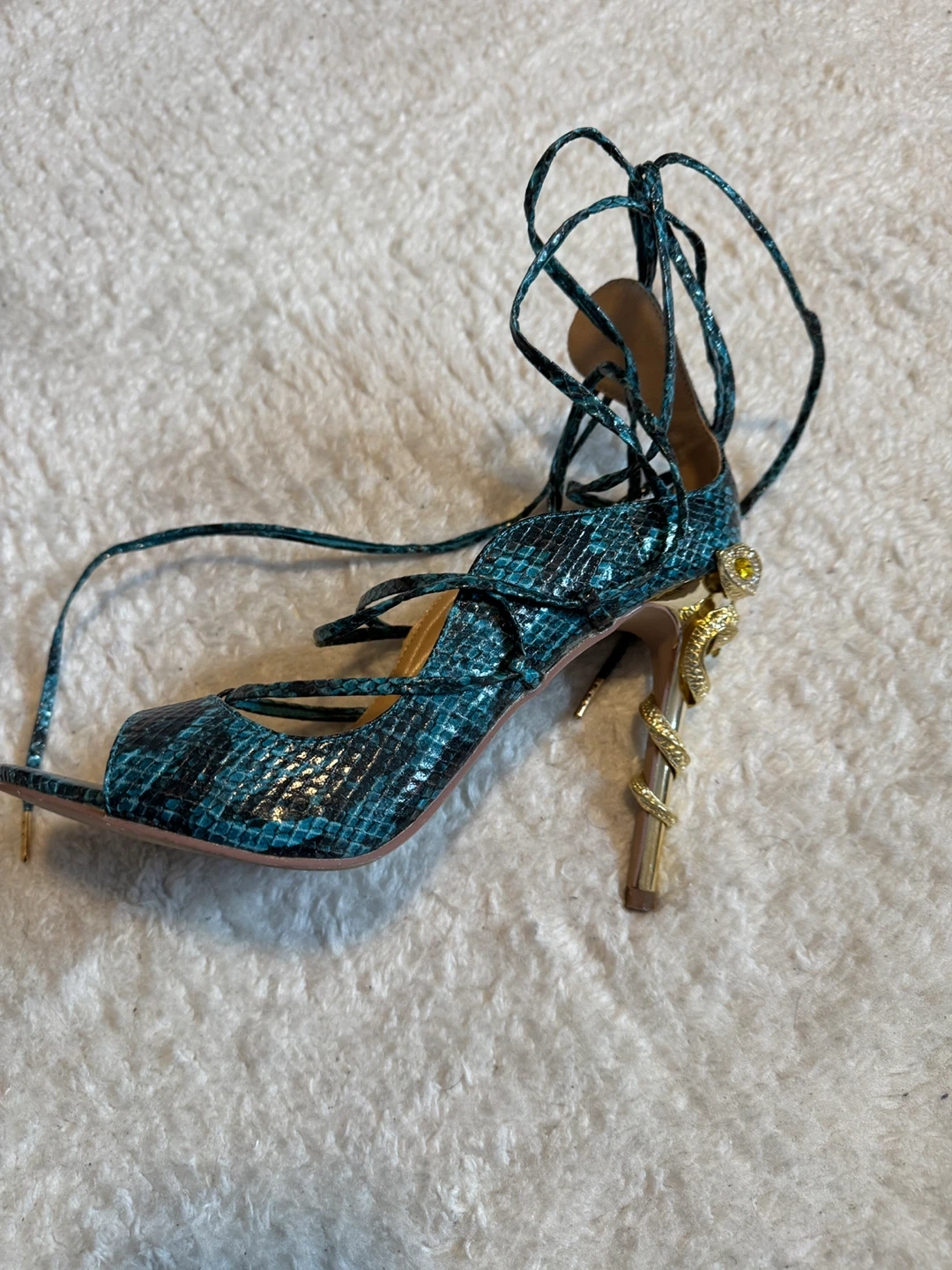 These stylish Steve Madden heels feature a bold teal snake print design and eye-catching gold heel detail. The wrap-around laces offer a secure and adjustable fit. Perfect for adding a statement to any outfit!