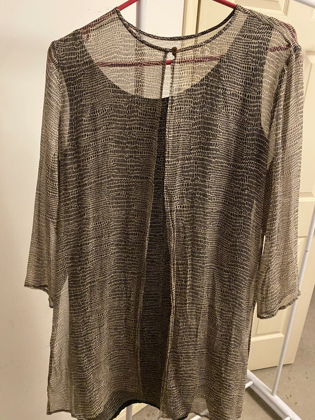 Lightweight sheer tunic with a dark patterned print. It's a long-sleeved, open-front style that drapes nicely. This piece adds a touch of flair over a solid top.