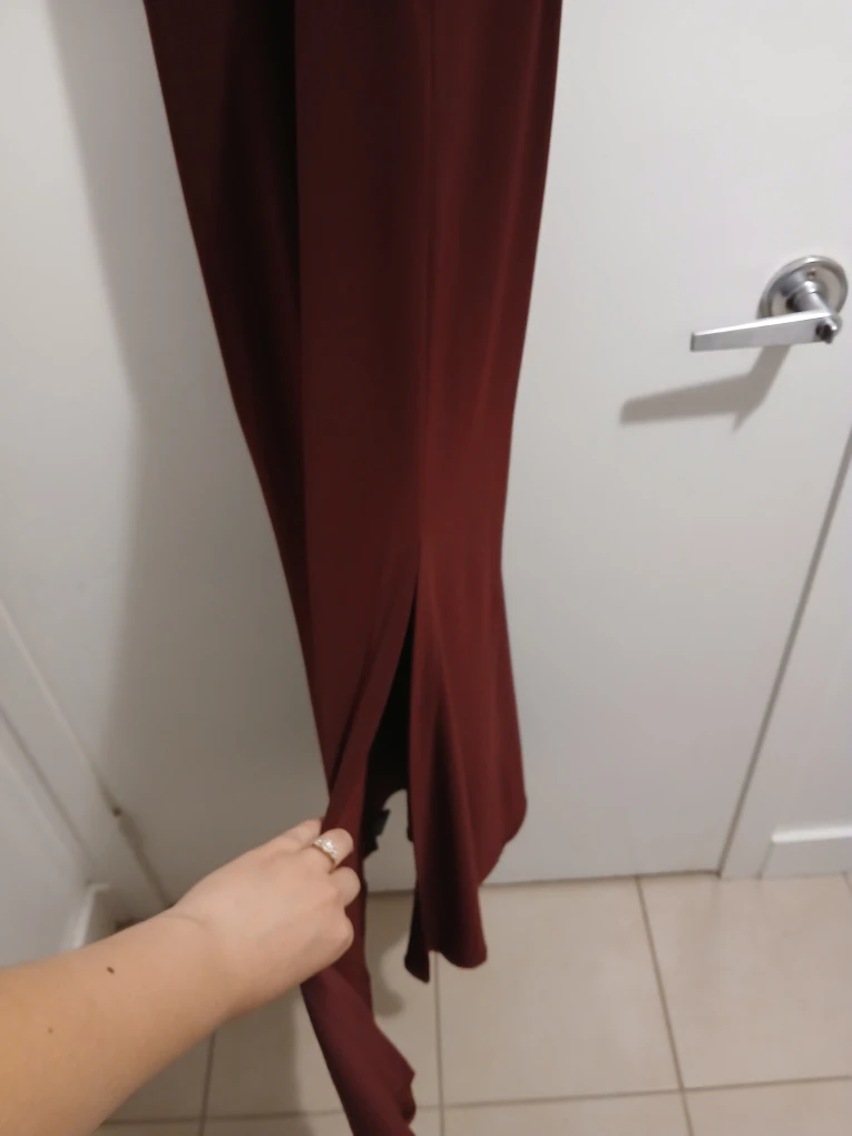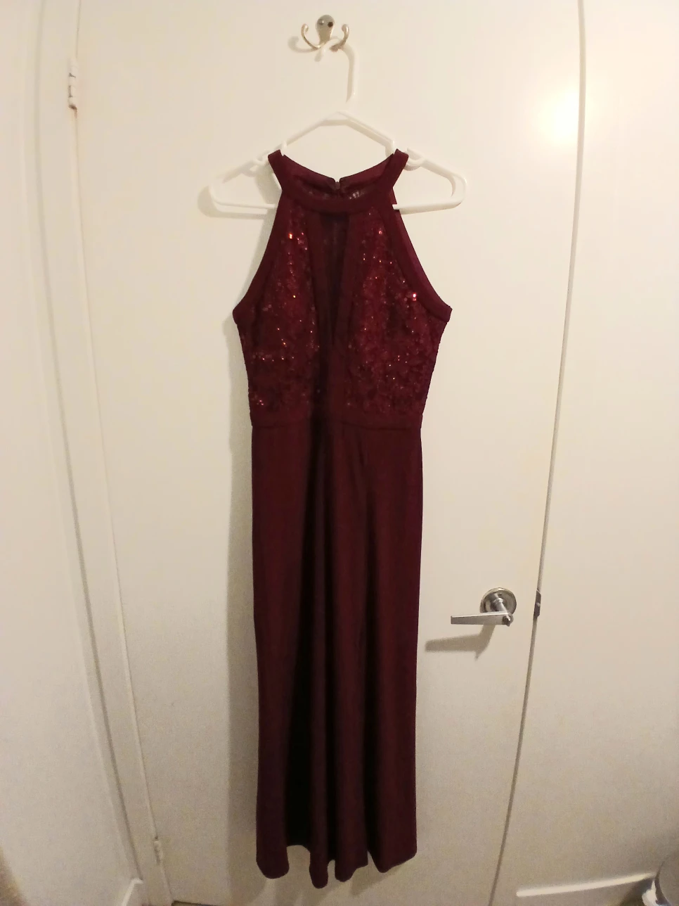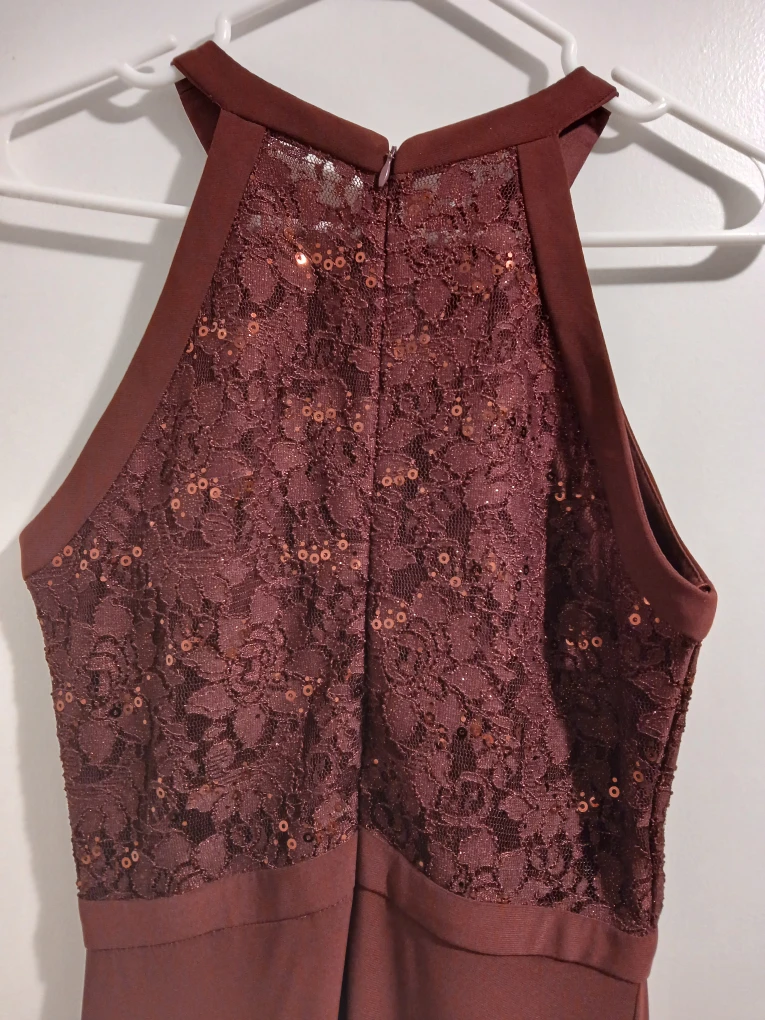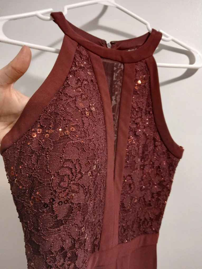 Type: Halter style formal sleeveless dress with sequins and crochet/lace area along the top part, small mesh part in the very middle top chest area; flowy on the bottom; slit on one side