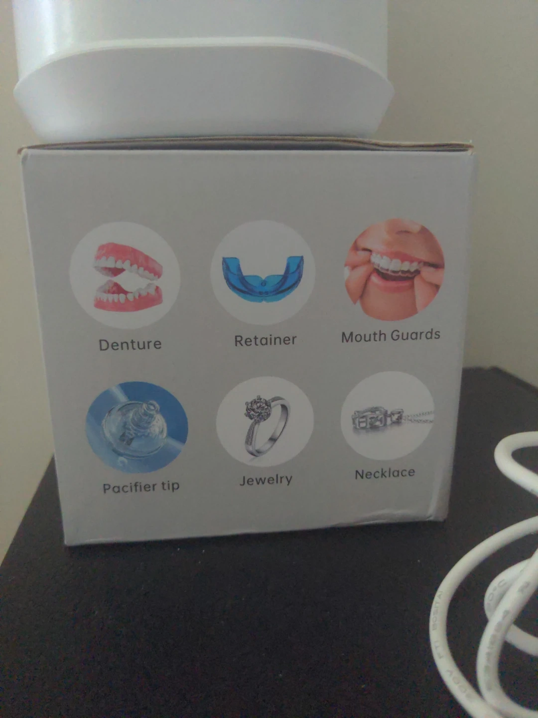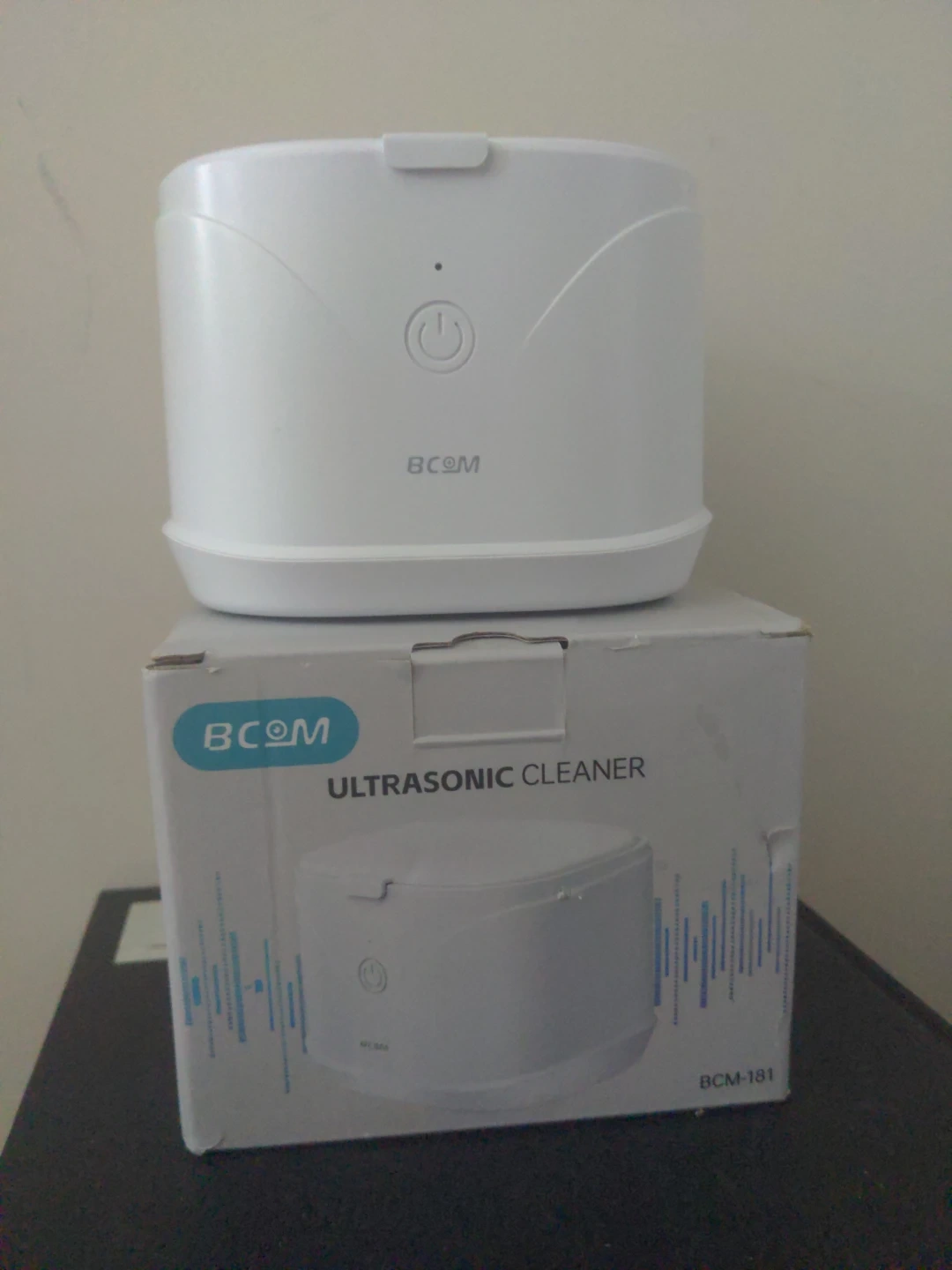 This is a BCOM ultrasonic cleaner, model BCM-181. It's designed for cleaning dentures, retainers, mouth guards, jewelry, and pacifier tips. Includes original box and power cord.