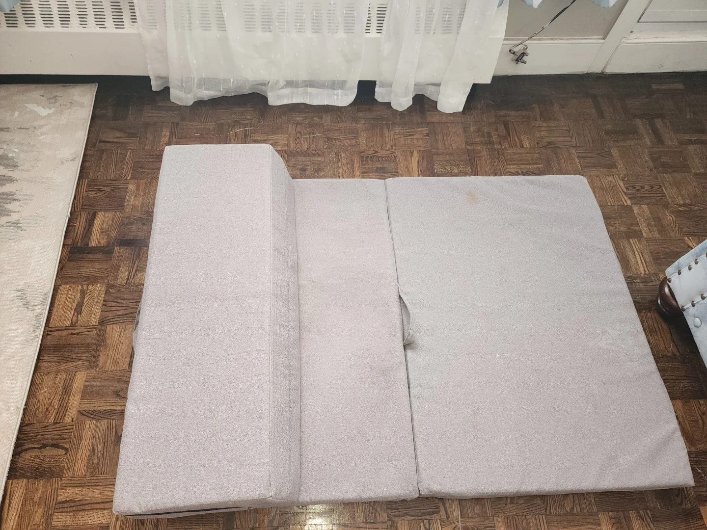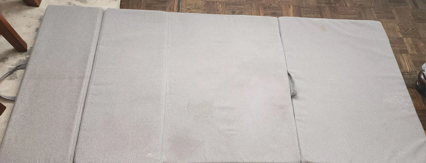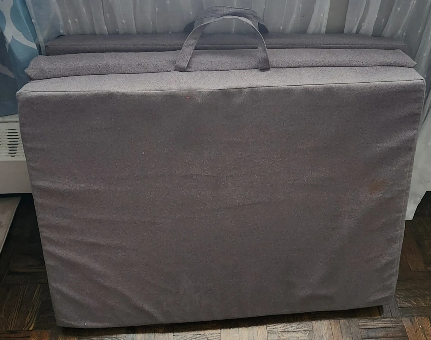 This tri-fold foam mattress is great for a guest bed or as a floor cushion. It's made of grey fabric and has convenient handles for transport. Includes a carrying case for easy storage and portability.