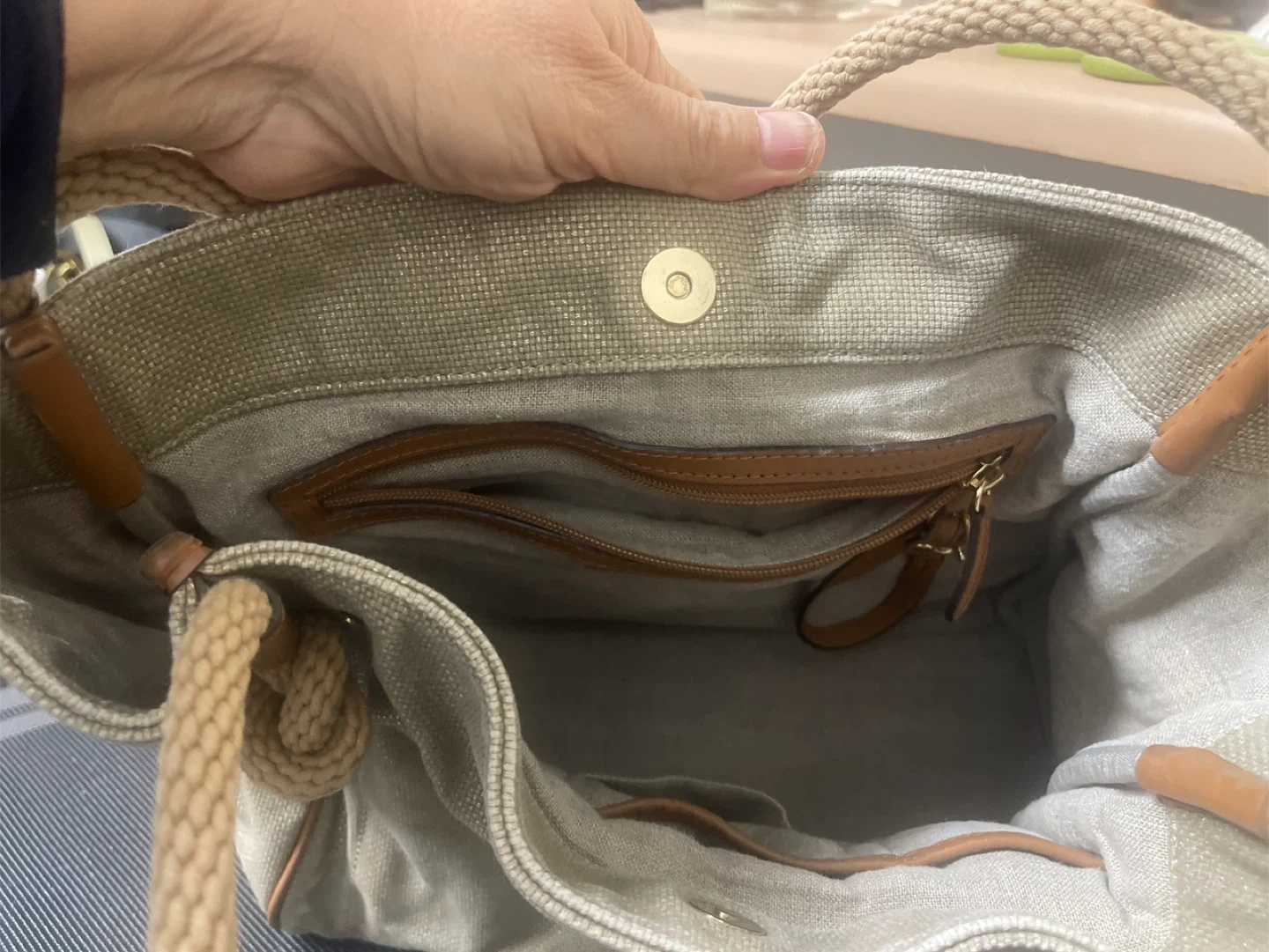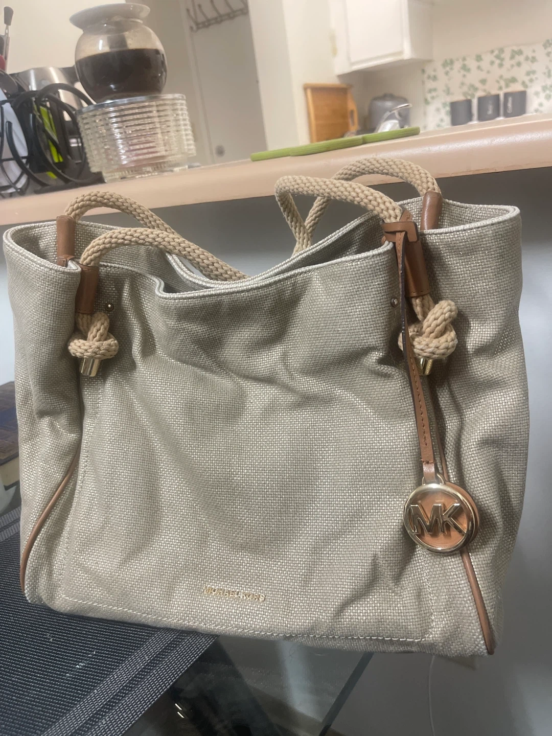 This is a stylish Michael Kors tote bag in great condition. It features rope handles and a spacious interior, perfect for everyday use. The bag has a neutral colour that will match any outfit. It's a great addition to your wardrobe!