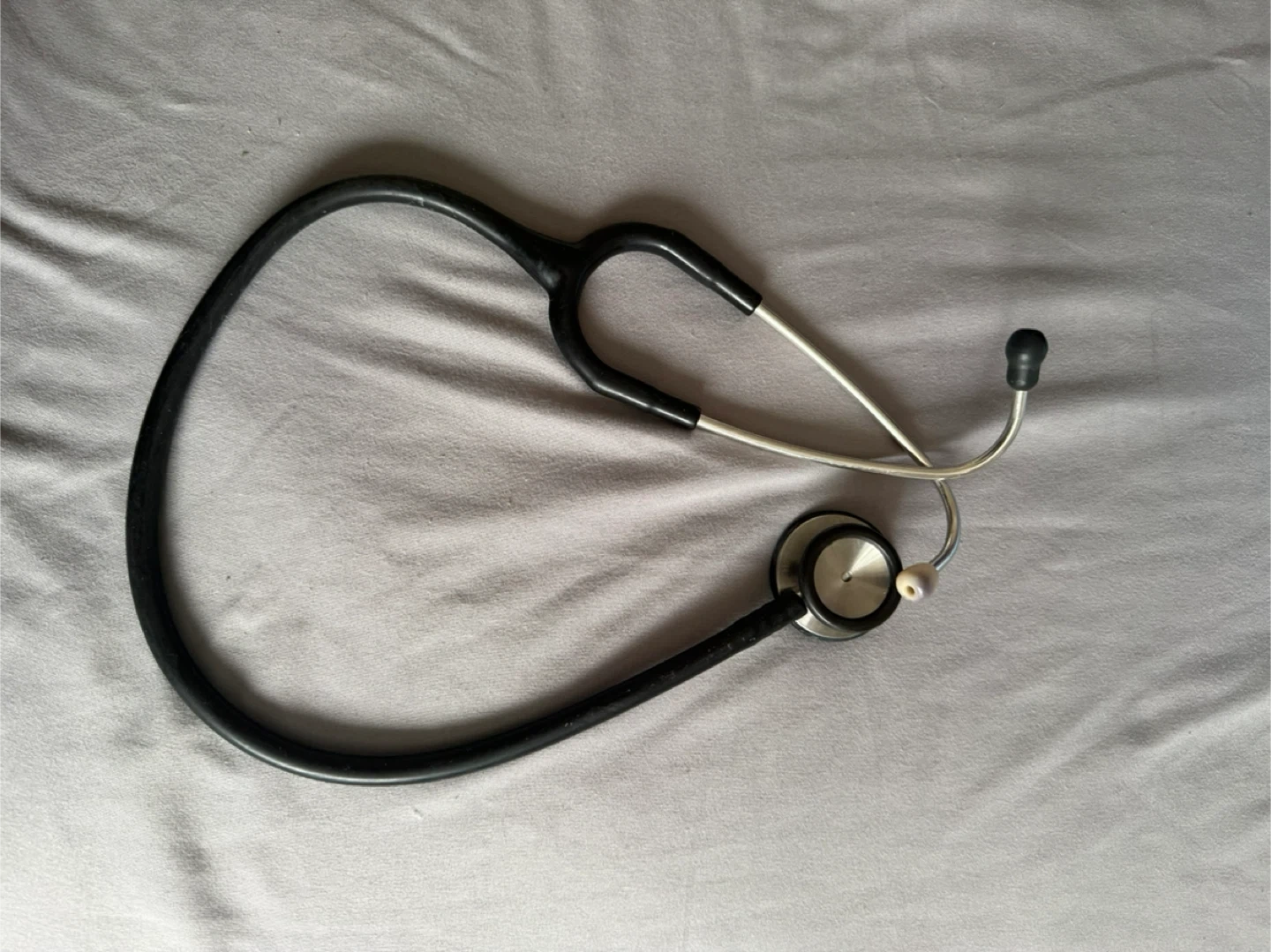Classic black Littmann stethoscope. It's in good condition and ready for its next owner. This medical tool is essential for healthcare professionals.