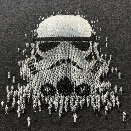 50% Cotton, 50% Polyester. In new condition. Stormtrooper graphic is made up of smaller stormtroopers. No cracking or peeling on graphic. Armpit to armpit: 23.5", Armpit to hem: 16", Shoulder to hem: 27.5". Measurements are approximate and taken while laying flat.