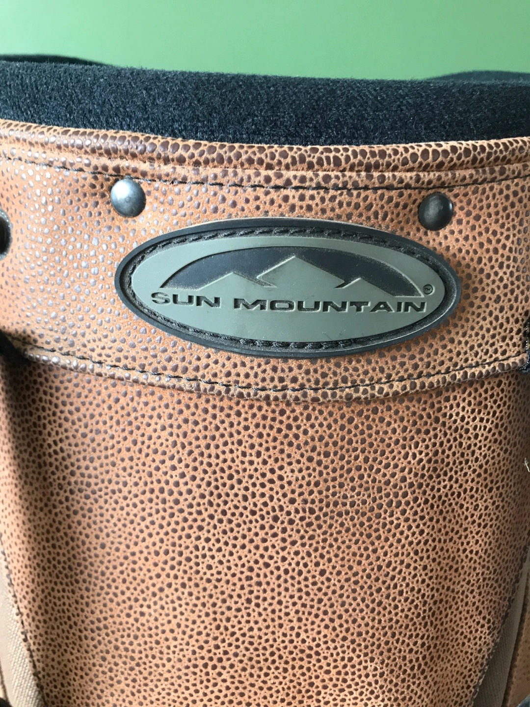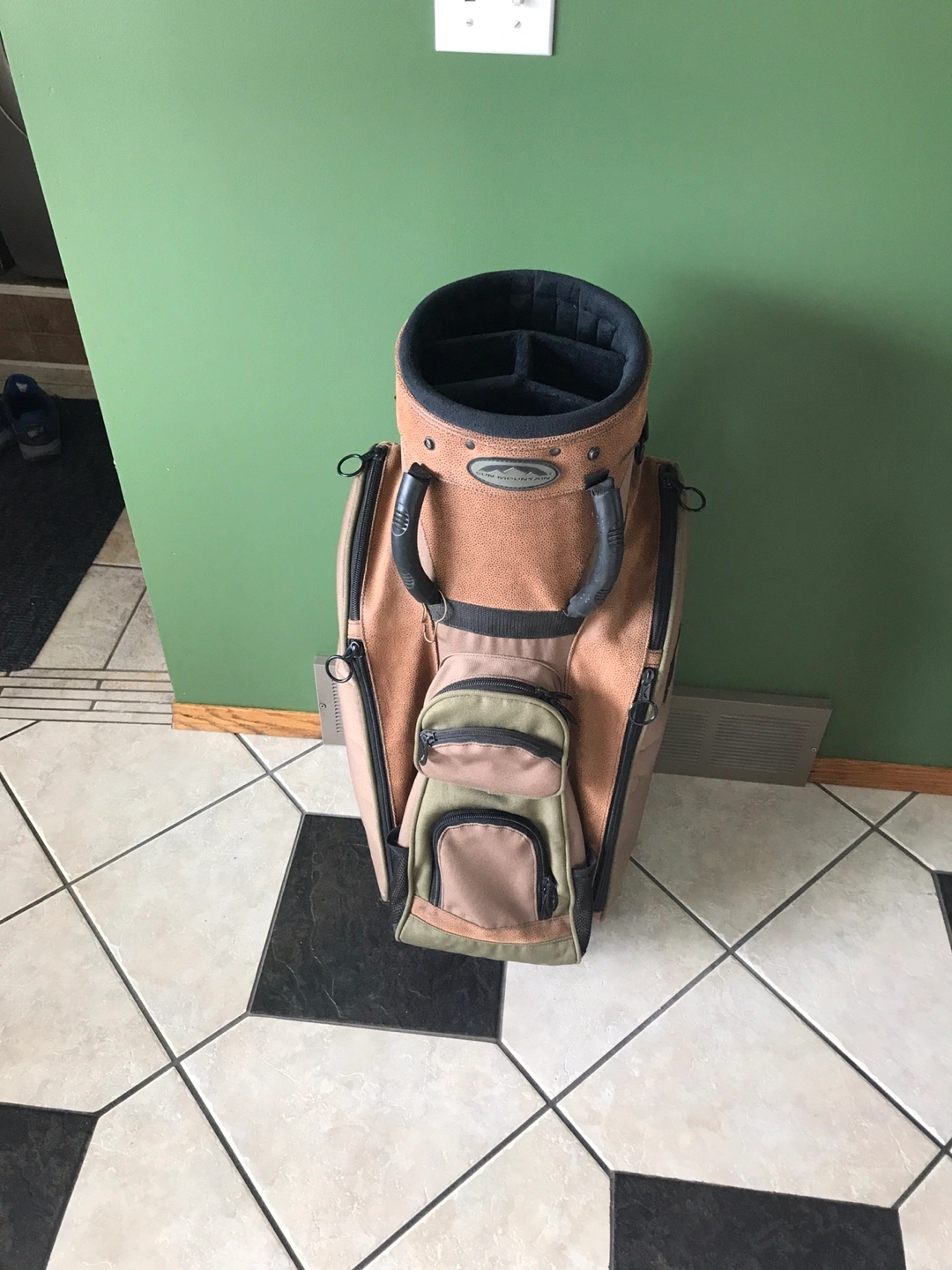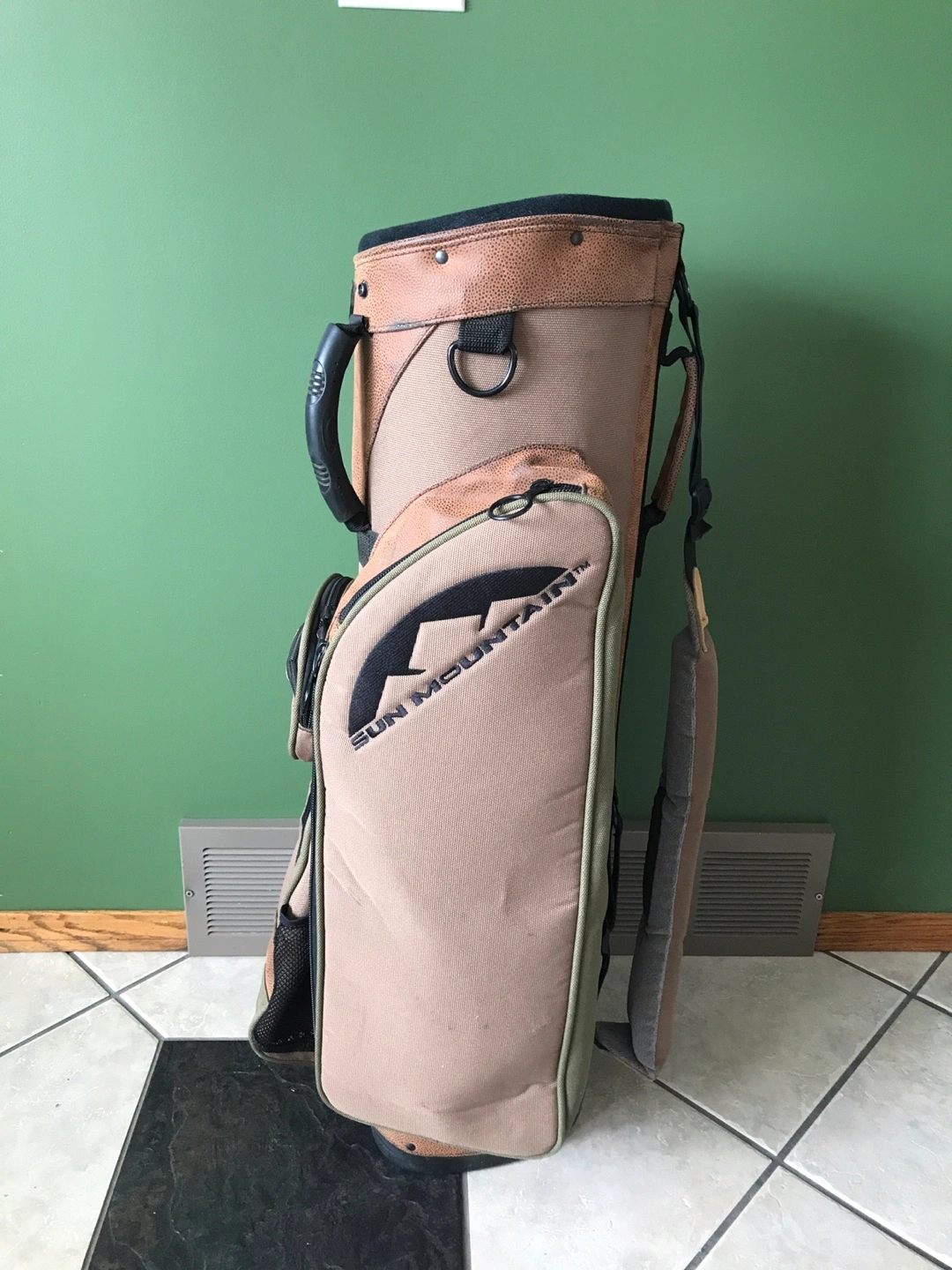 Sun Mountain golf bag in a tan and green colourway. It has multiple pockets for all your gear. Padded shoulder strap included for comfortable carrying. In good condition. $60.00