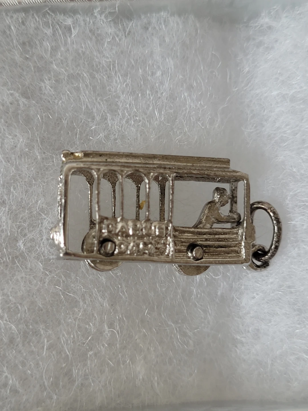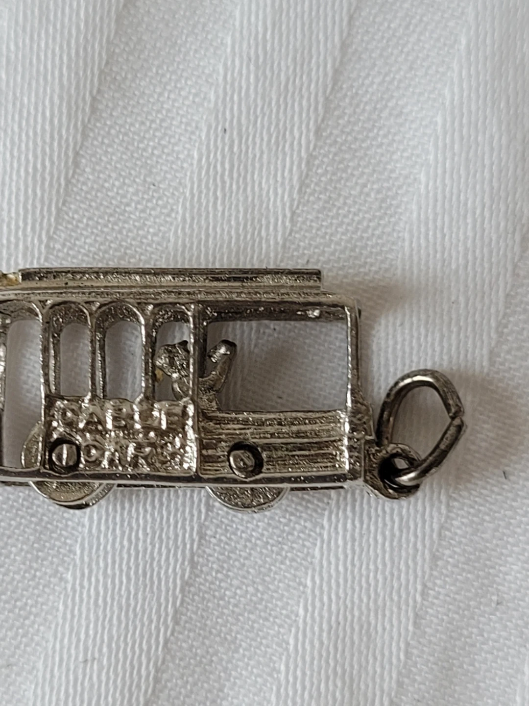 This sterling silver charm shaped like a cable car. It has "CABLE CAR" engraved on the side. The conductor moves back and forth in the car. The charm includes a jump ring for attachment. It measures about 1 inch in length.