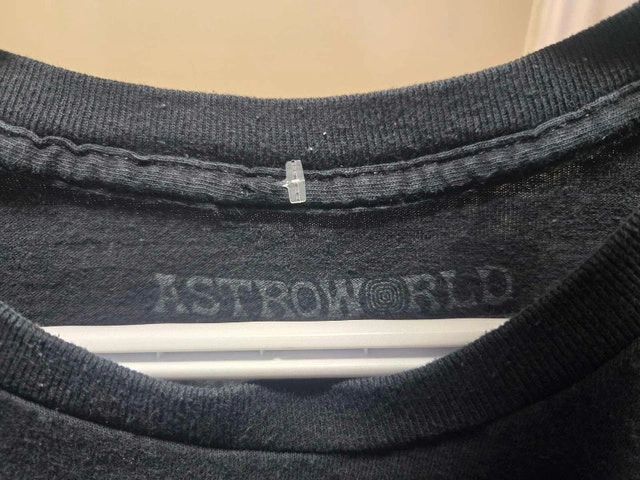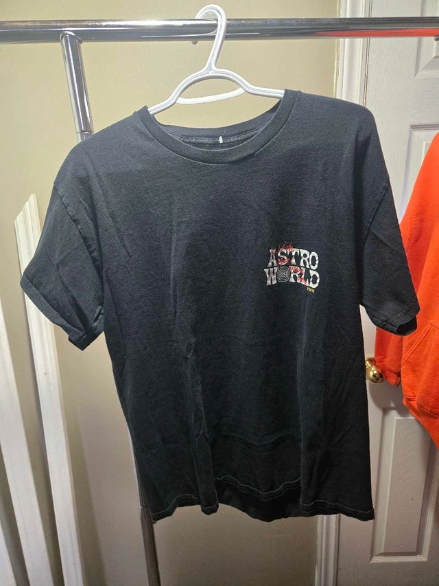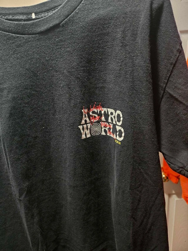 Selling a used Travis Scott Astroworld tour T-shirt with a cool graphic print. It shows some signs of wear but is still in good condition for any fan. Own a piece of music history! Artist: Travis Scott, Tour: Astroworld, Colour: Black, Size: L. Asking $45.00. Still available if you see this ad.