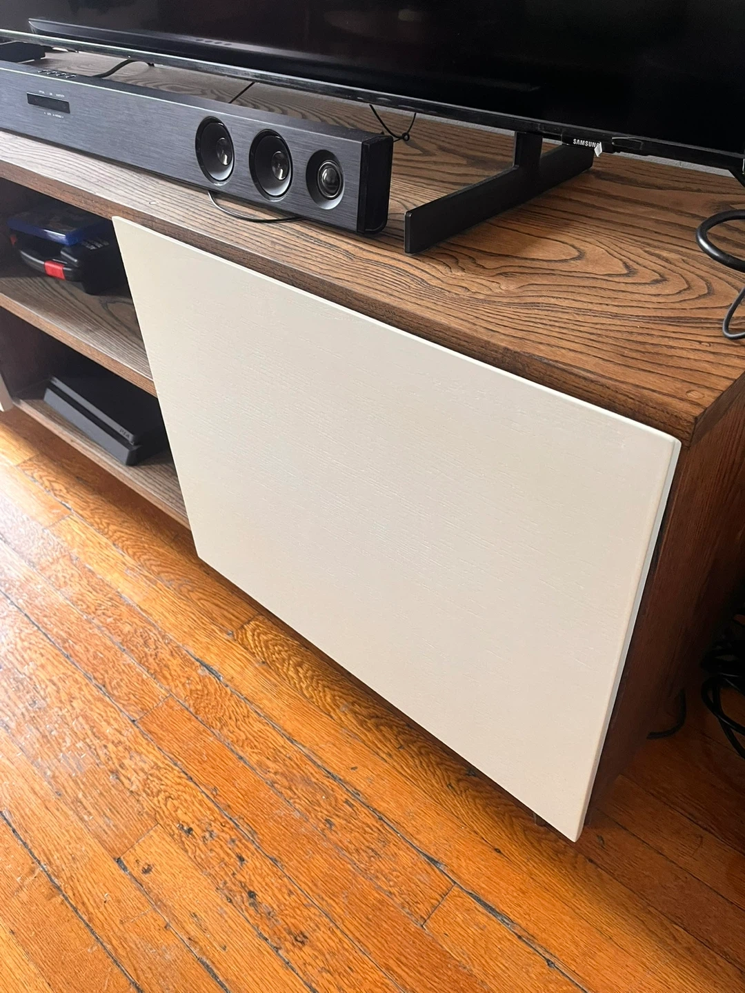 Media console with two white cabinet doors and open shelving. Wood grain finish on the main body. Perfect for storing electronics and media accessories.
