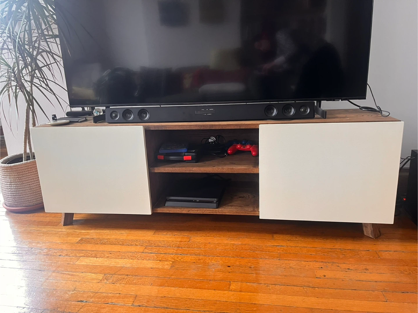 Media console with two white cabinet doors and open shelving. Wood grain finish on the main body. Perfect for storing electronics and media accessories.