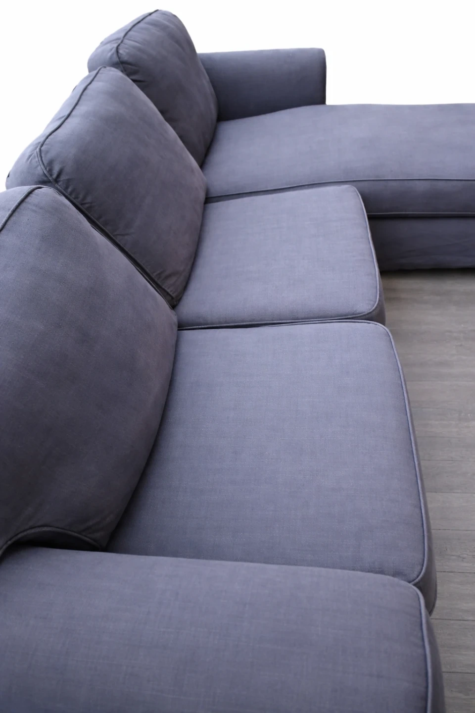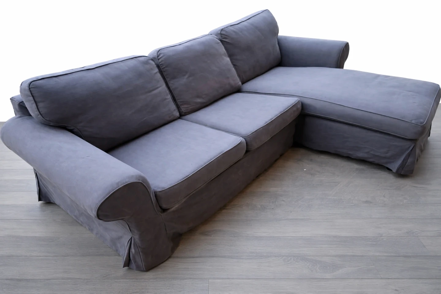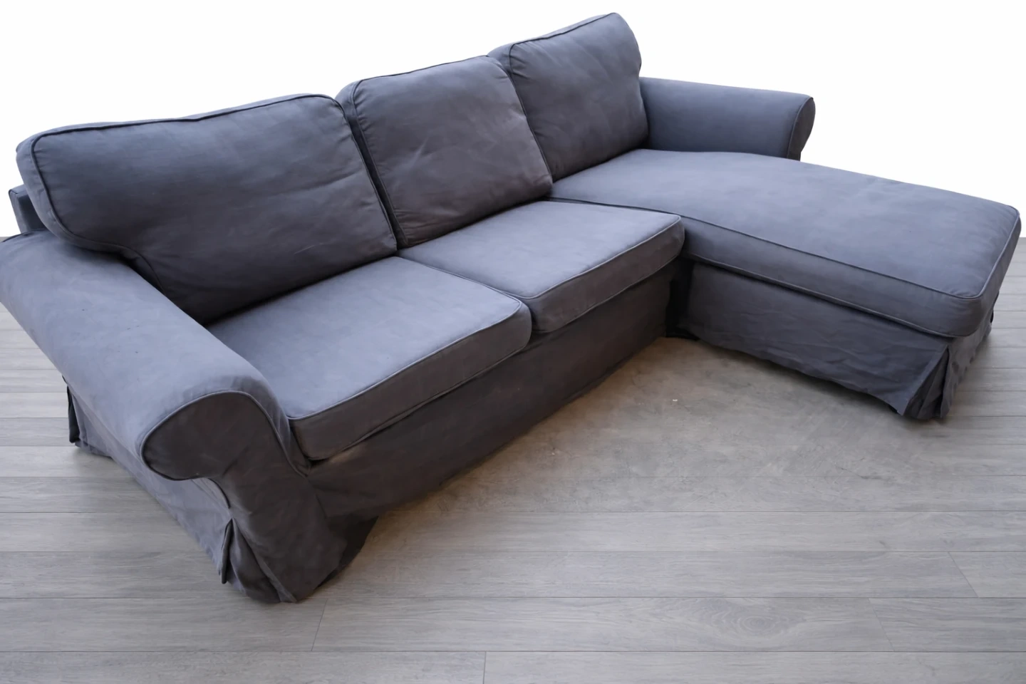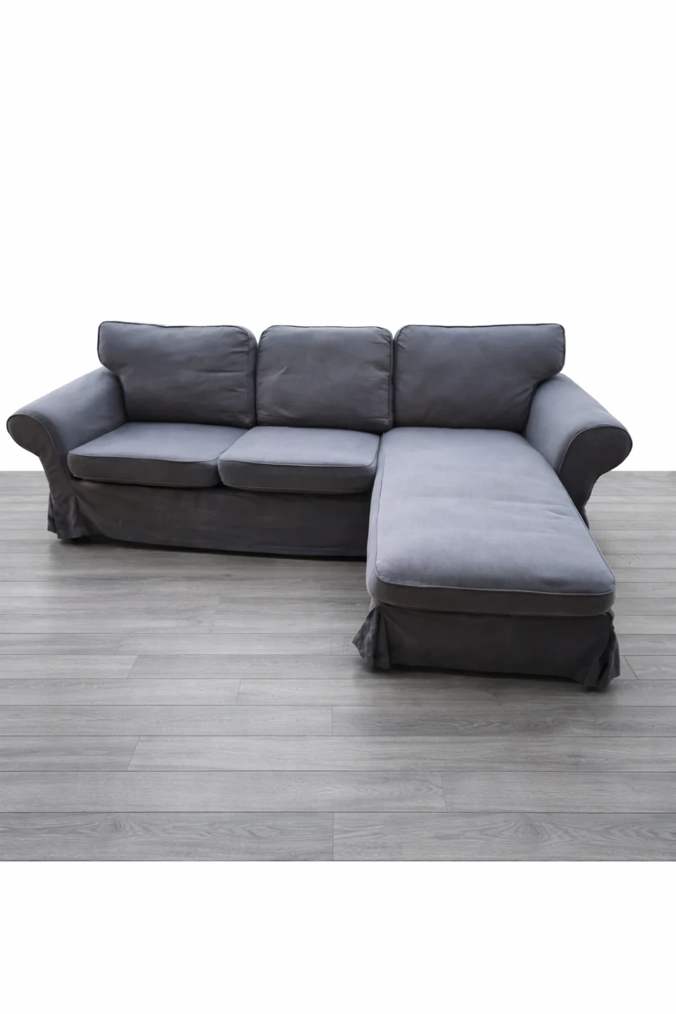 Grey fabric sectional sofa with a chaise lounge. Includes three seat cushions and multiple back cushions. The sofa's L-shape configuration provides ample seating. It's a comfortable piece for a living room or den.