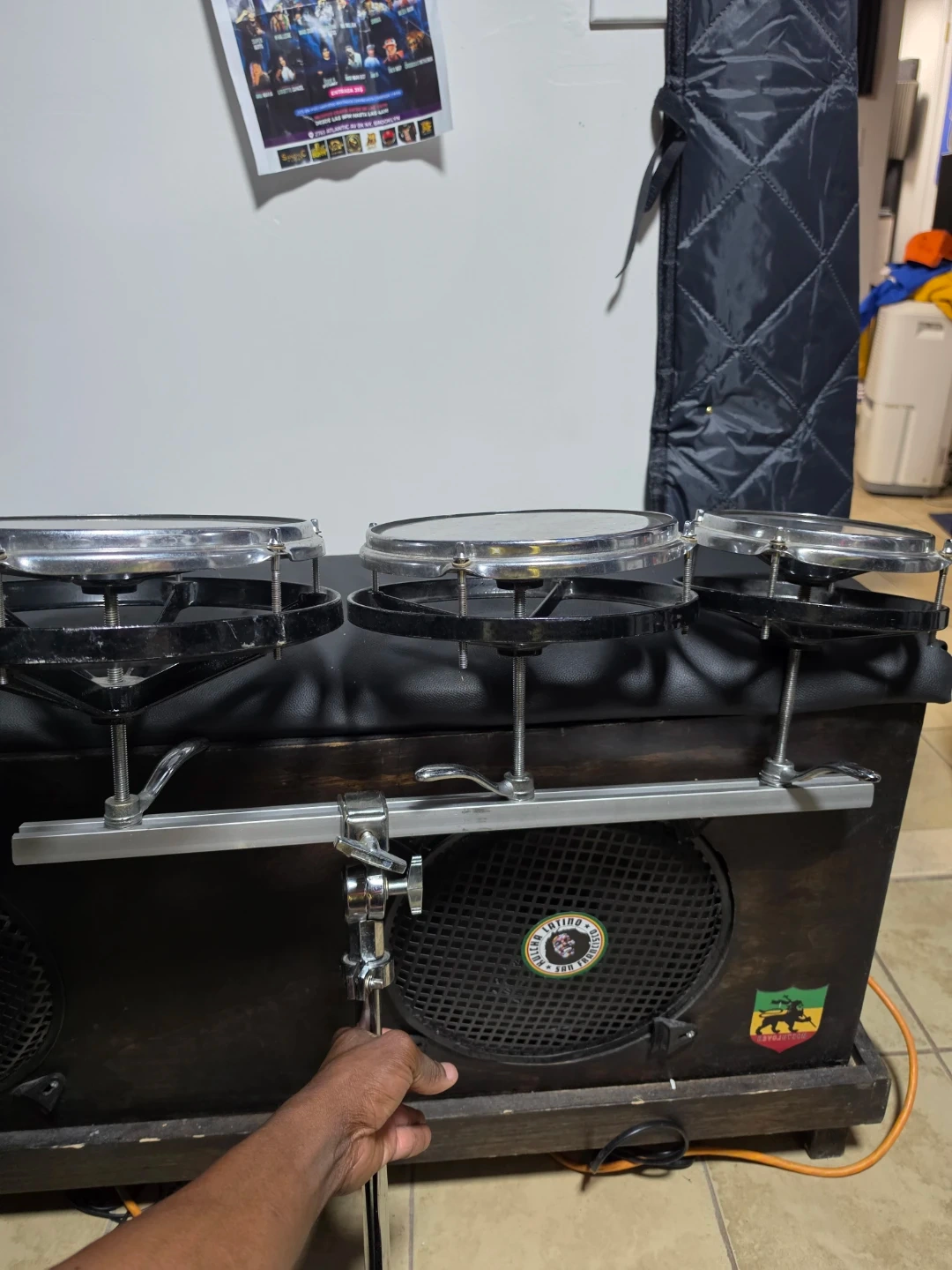 This is a set of three percussion drums. They're mounted on a metal stand. The drums have metal rims and synthetic heads.