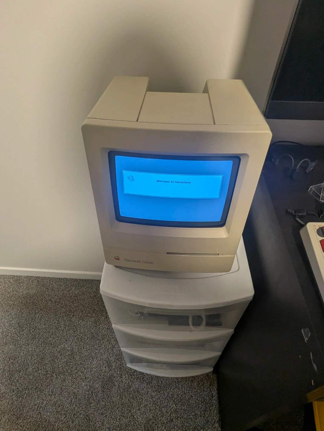 Apple Macintosh Classic all-in-one computer. It boots up to the System Startup screen and "Welcome to Macintosh" dialog. This is a classic piece of computing history!
