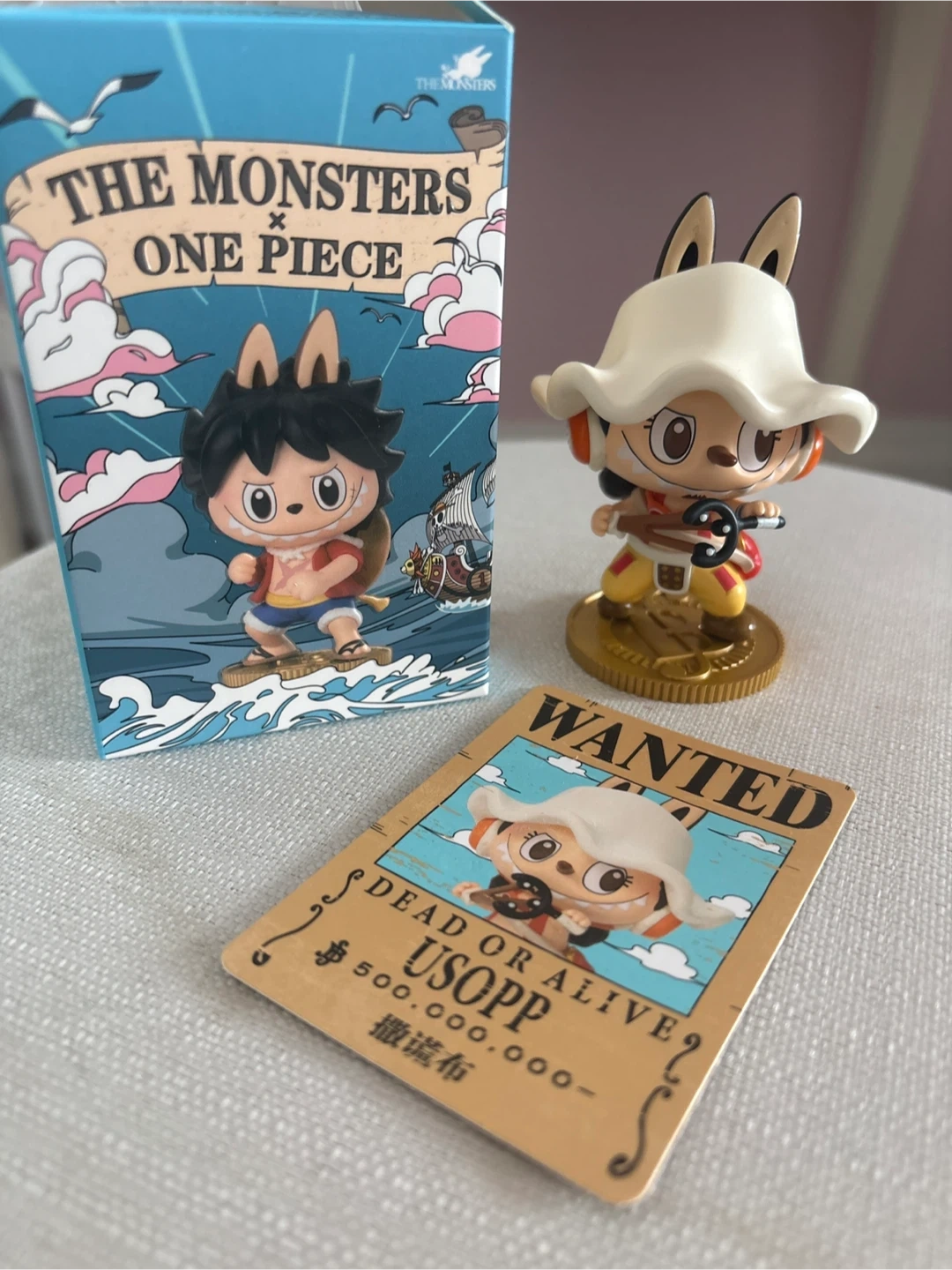 This is a collectible figure from The Monsters x One Piece series. It is Usopp with his slingshot and hat. Includes the "Wanted" poster accessory and "Berry Coin" stand.