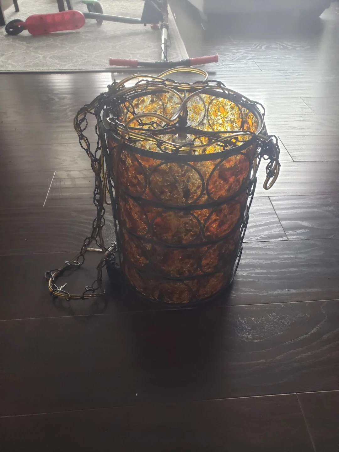 This is a decorative hanging pendant light fixture. It features a unique amber glass design with intricate metal detailing and a hanging chain. It's a charming piece that would add a warm glow to any room. It's perfect for someone looking to add vintage flair to their home decor.