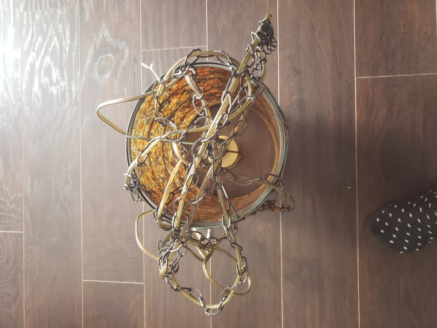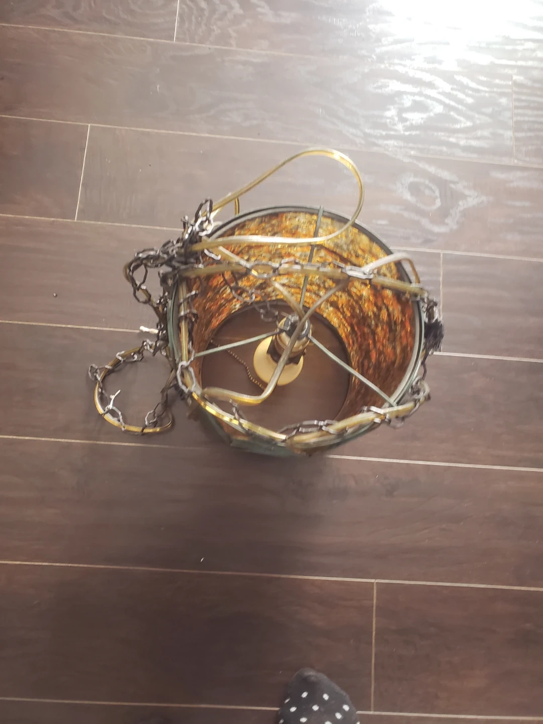 This is a decorative hanging pendant light fixture. It features a unique amber glass design with intricate metal detailing and a hanging chain. It's a charming piece that would add a warm glow to any room. It's perfect for someone looking to add vintage flair to their home decor.