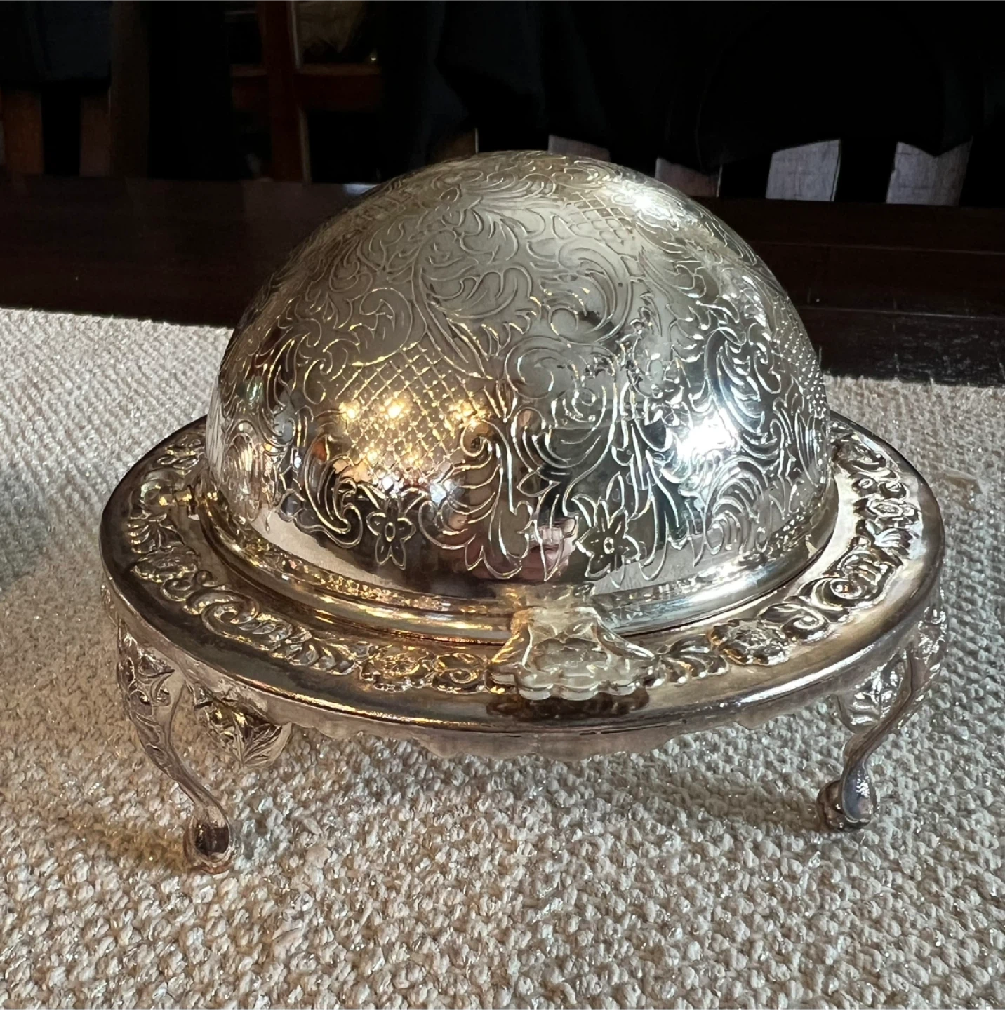 Commonly referred to as a Queen Anne style server, featuring a revolving "hooded" lid with intricate floral engravings