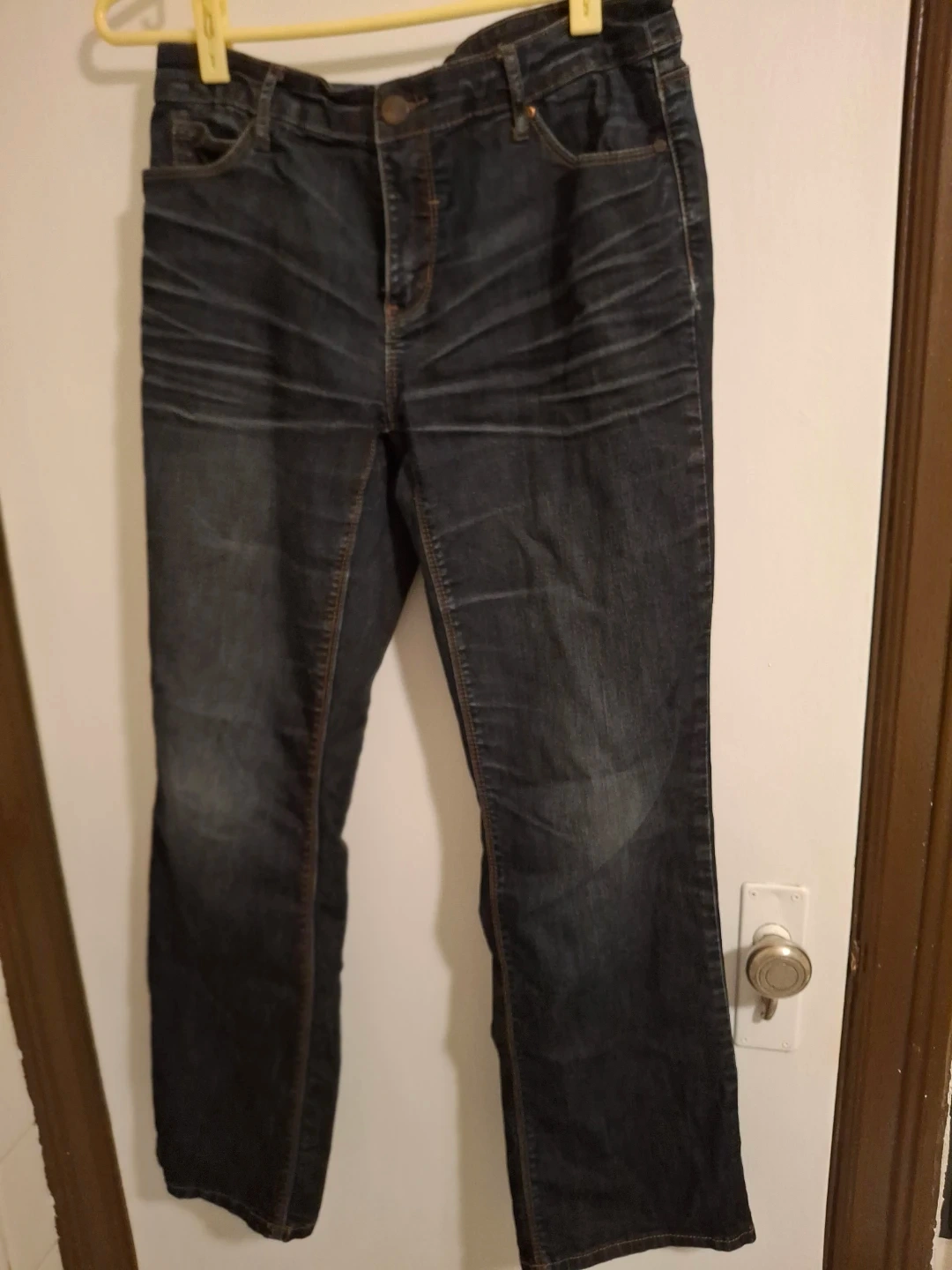 Dark wash denim jeans from Reitmans. Petite size 29. These jeans have a classic five-pocket design with some whiskering details. They're a comfortable option for everyday wear.