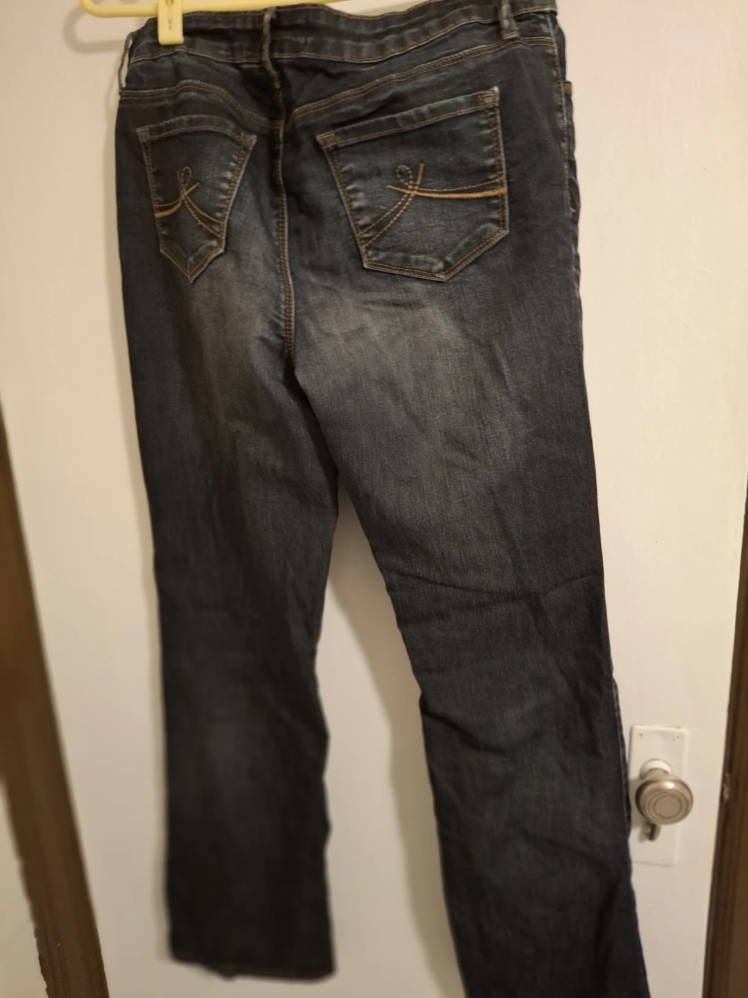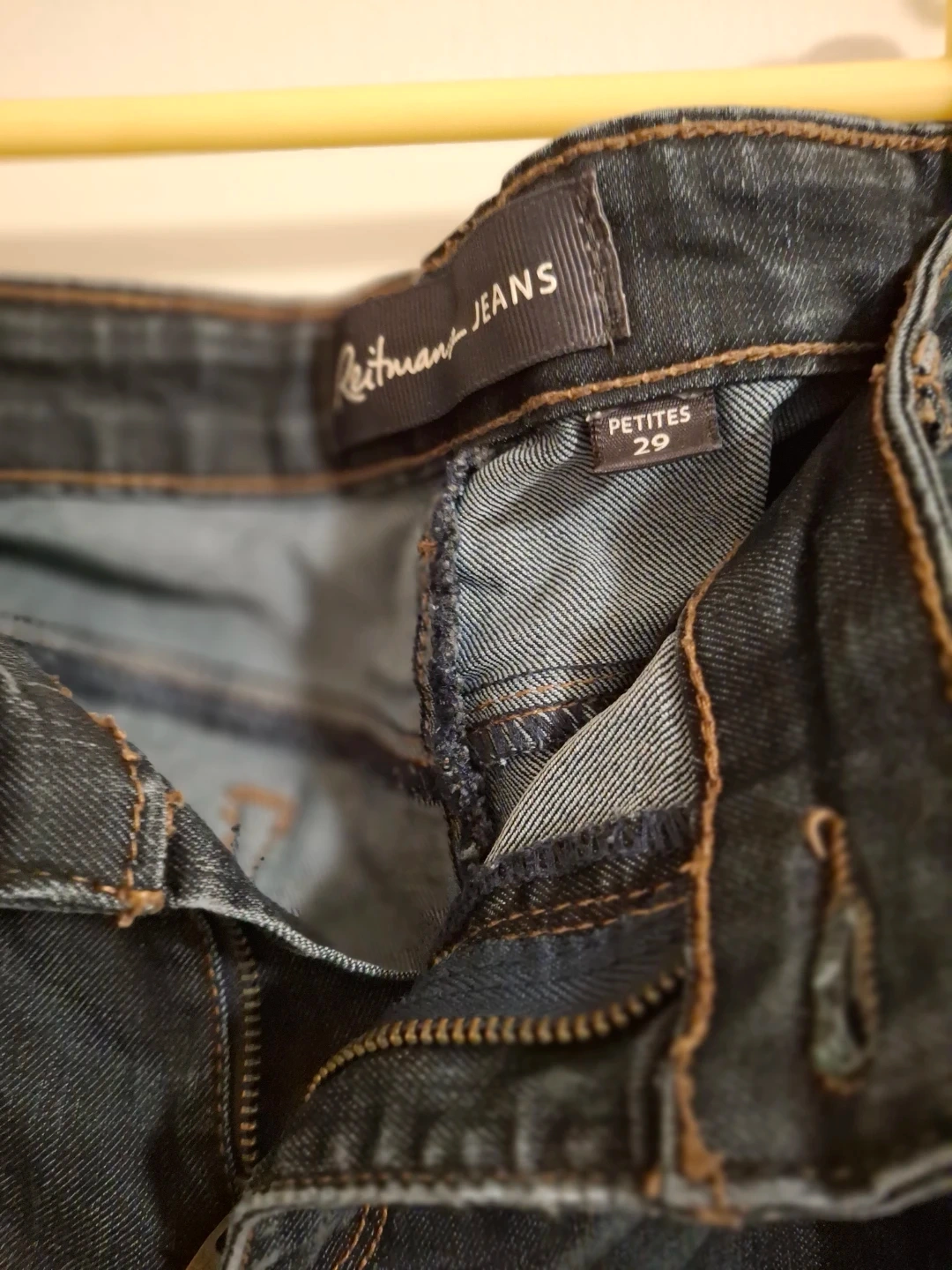 Dark wash denim jeans from Reitmans. Petite size 29. These jeans have a classic five-pocket design with some whiskering details. They're a comfortable option for everyday wear.