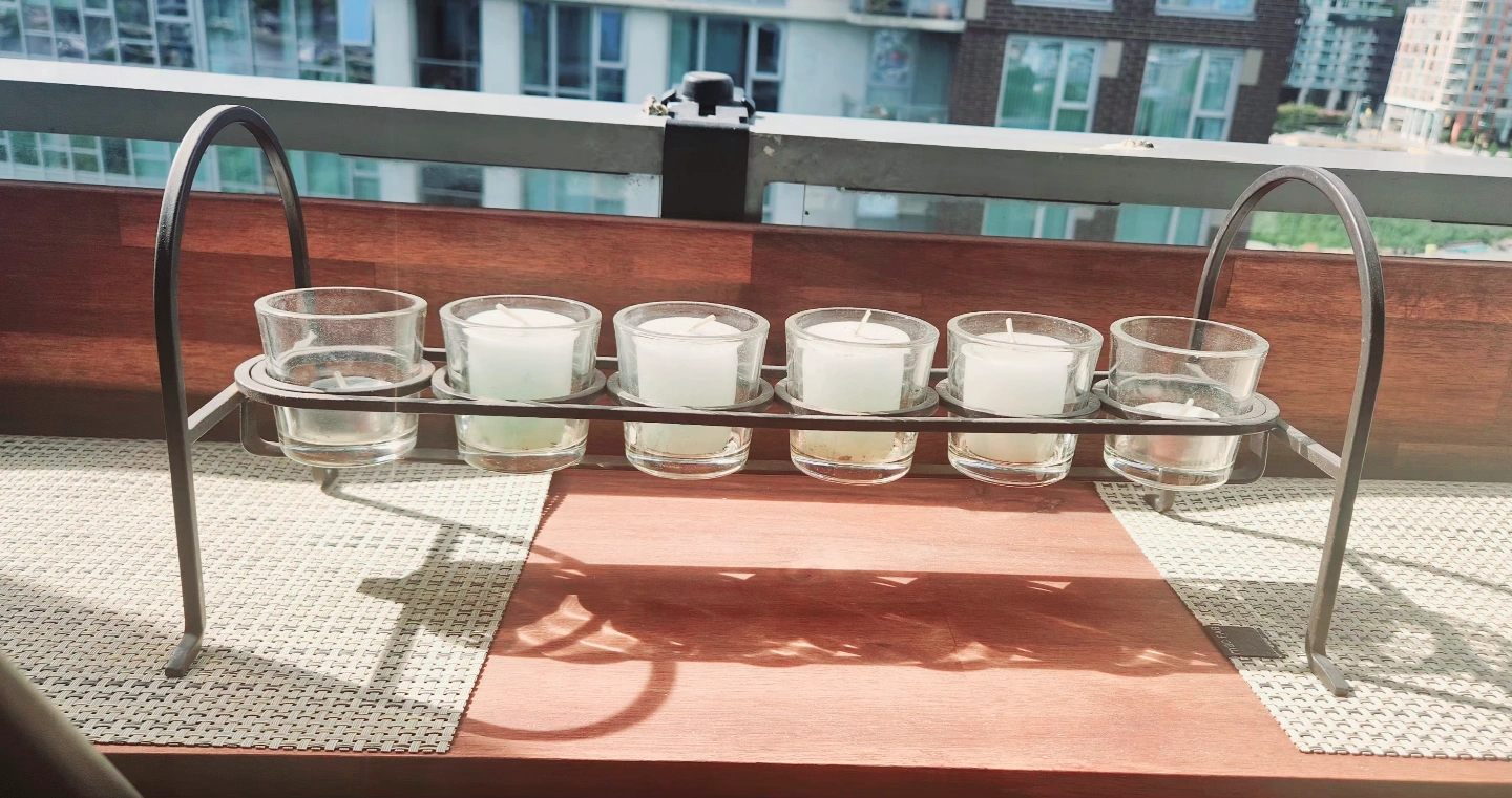 Add some ambience to any space, indoor or out with this wrought iron metal candle holder with six glass cups. Perfect for votive candles or tealights. Good condition with no rust on the metal or cracks in the glass. Includes 4 votive candles and 2 tealights. Measures approximately 17" long, and 7.5" wide/ high.