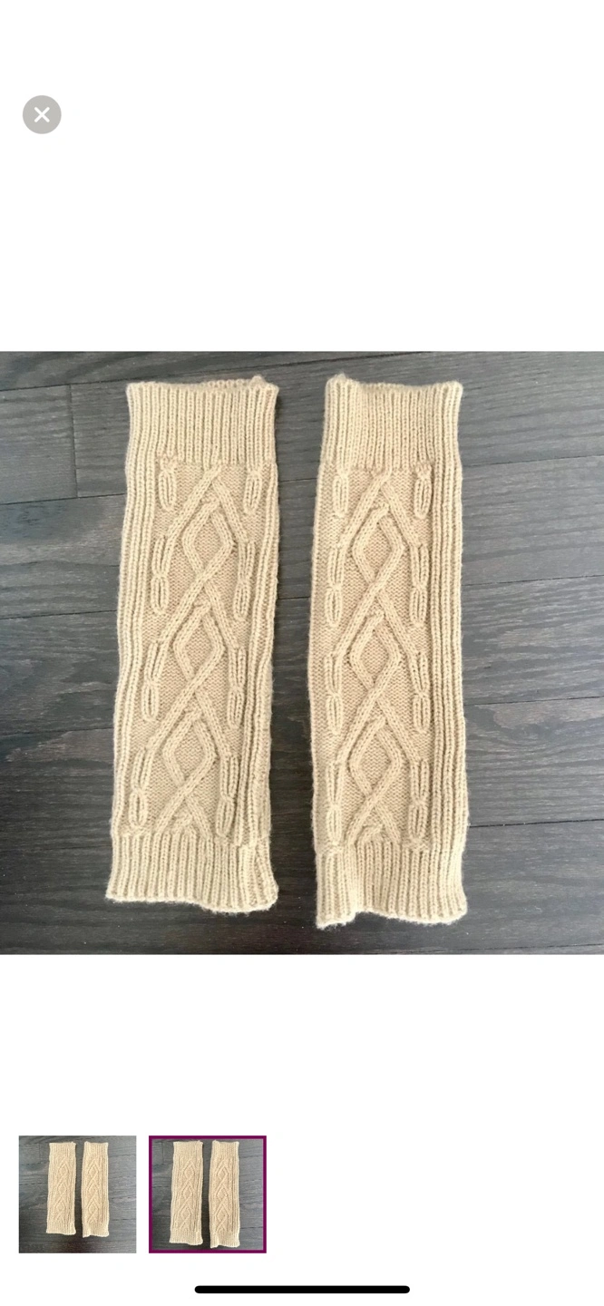 Pair of beige knitted arm warmers. Cable knit design. Soft and cozy. Perfect for fall and winter.