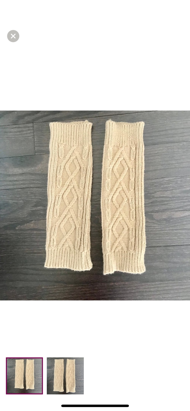 Pair of beige knitted arm warmers. Cable knit design. Soft and cozy. Perfect for fall and winter.
